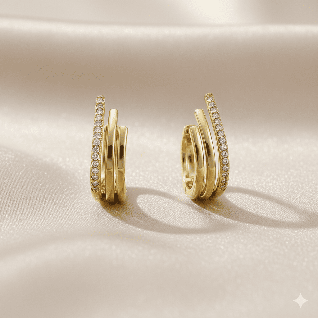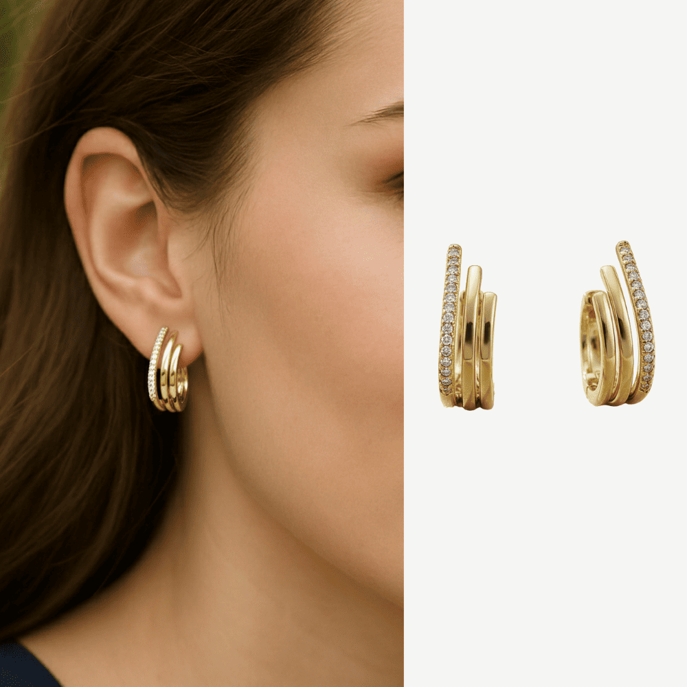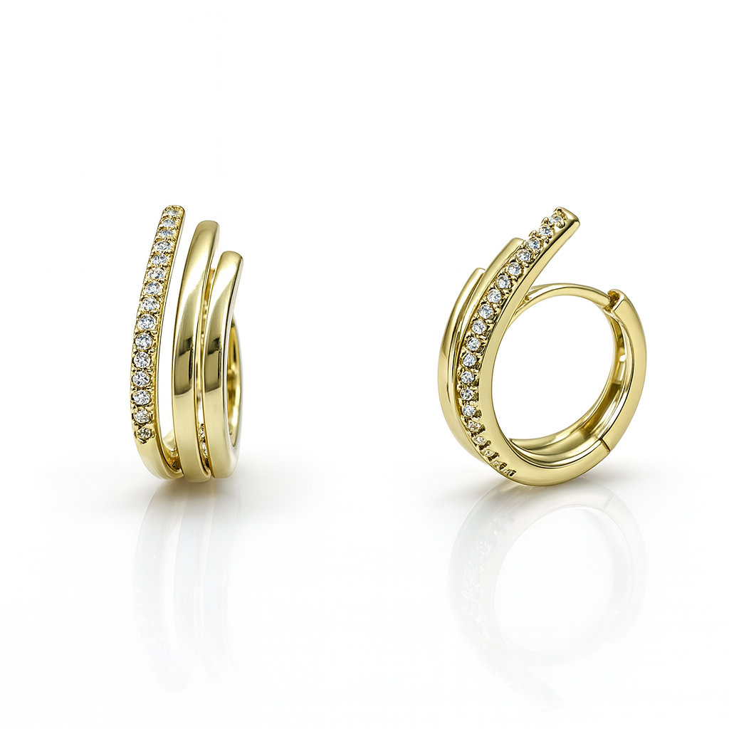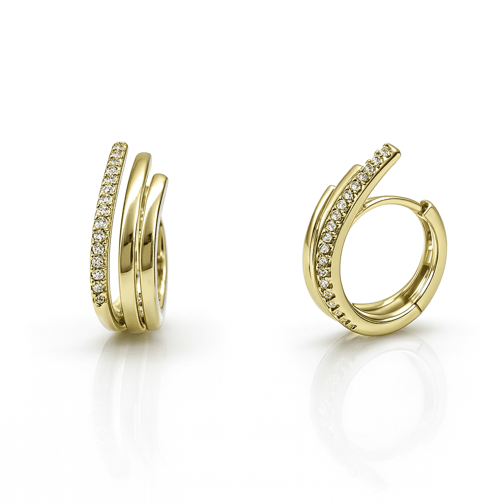 Kadın Xuping Çelik Küpe - 3 Sıra Asimetrik Tasarım - Beyaz Zirkon Taşlı - Altın Renk