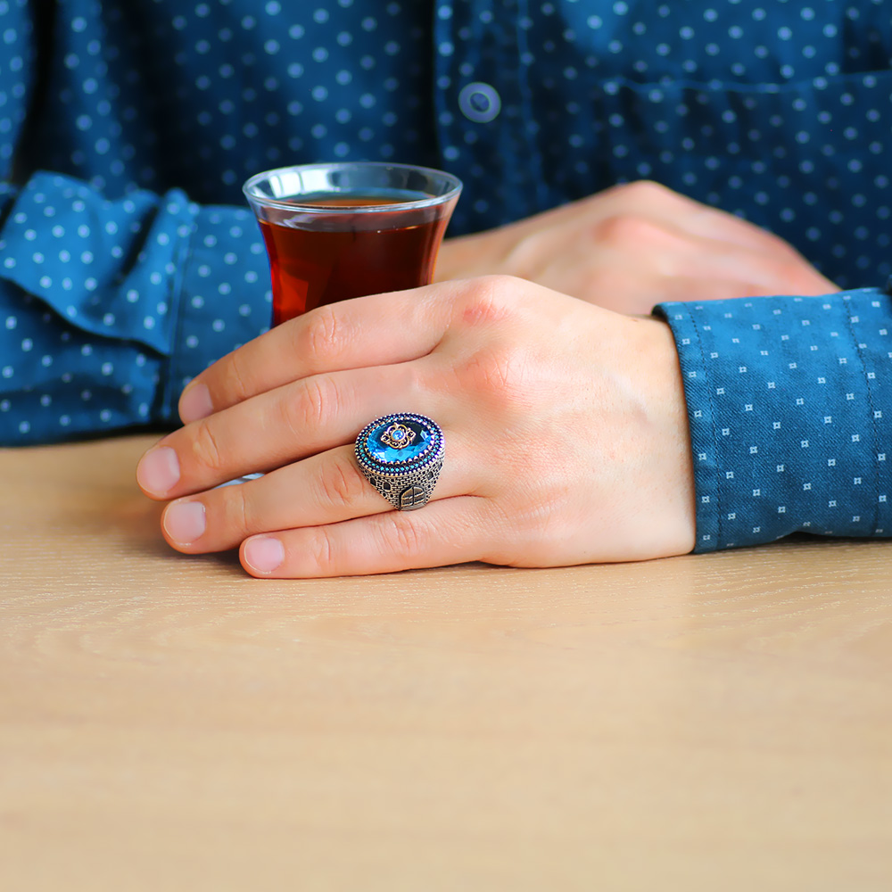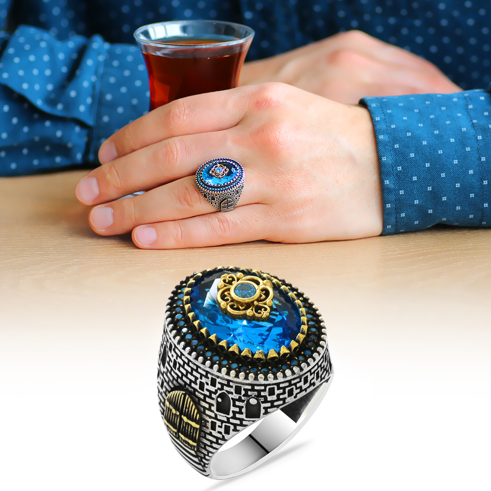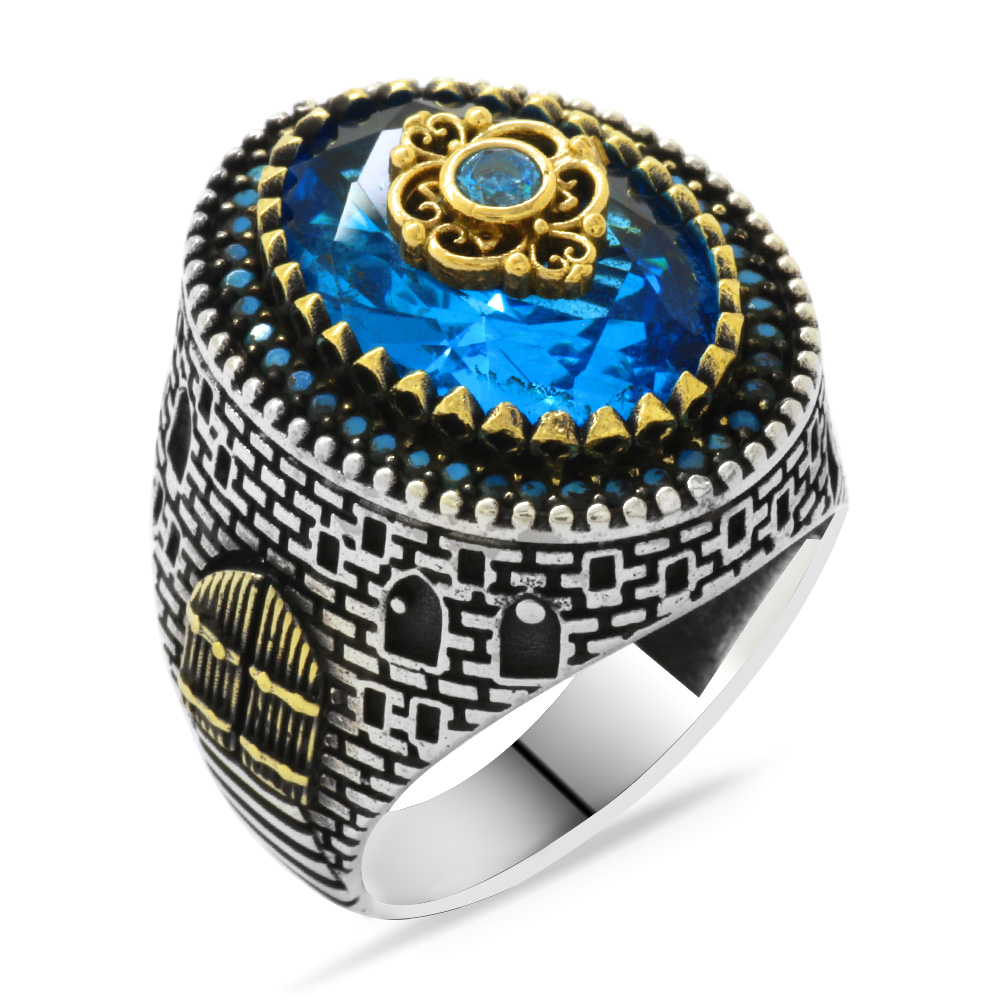 Kale Tasarım Faset Kesim Aqua Mavi Zirkon Taşlı 925 Ayar Gümüş Erkek Yüzük