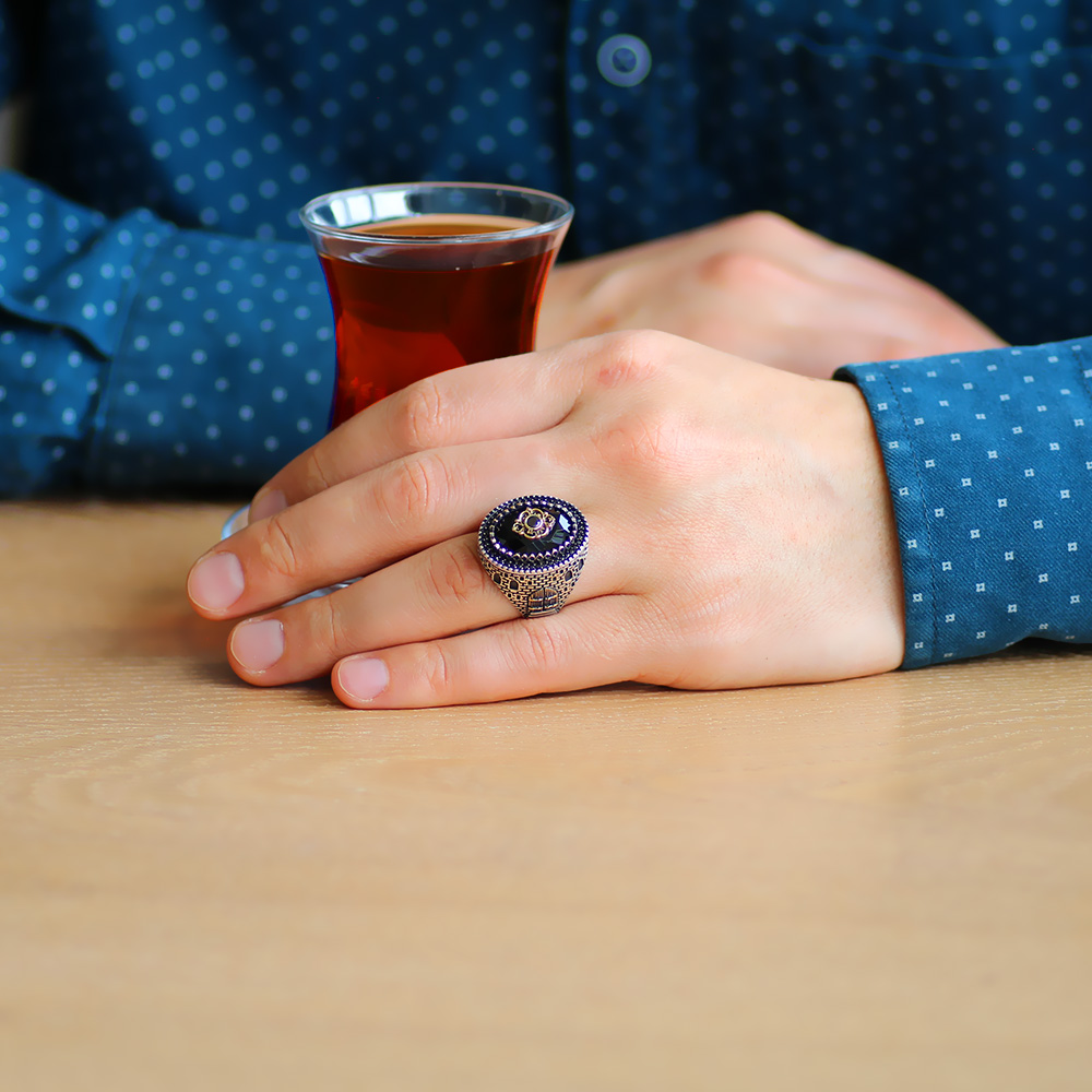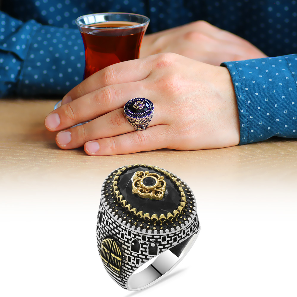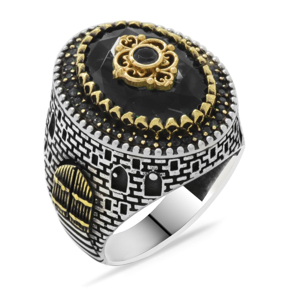 Kale Tasarım Faset Kesim Siyah Zirkon Taşlı 925 Ayar Gümüş Erkek Yüzük