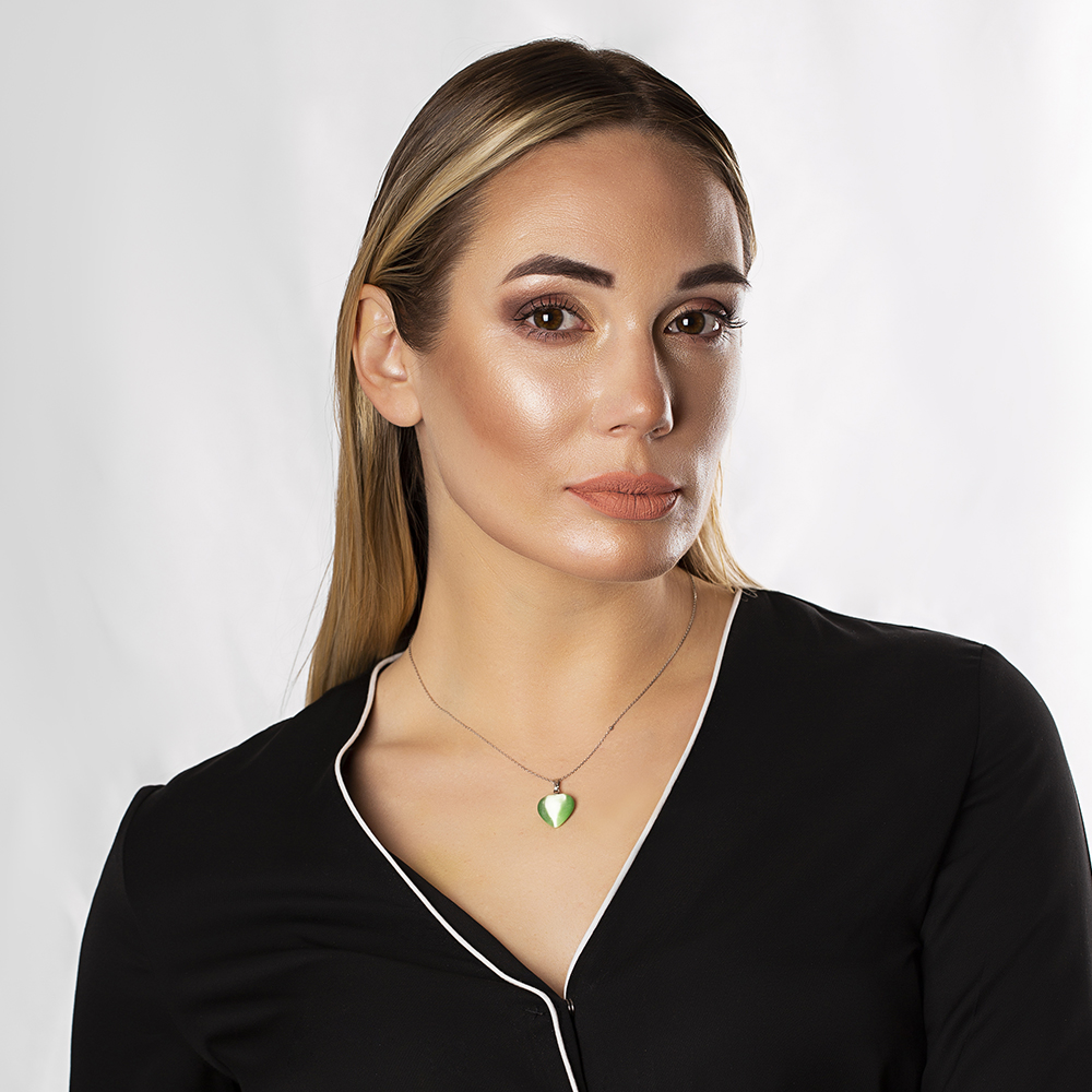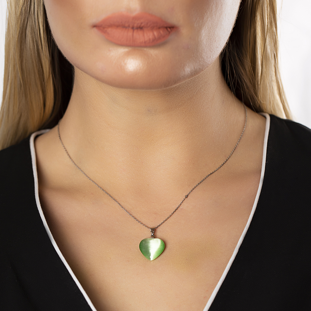 Kalp Tasarım 925 Ayar Gümüş Zincirli Çift Taraflı Fıstık Yeşil Kedigözü Kolye