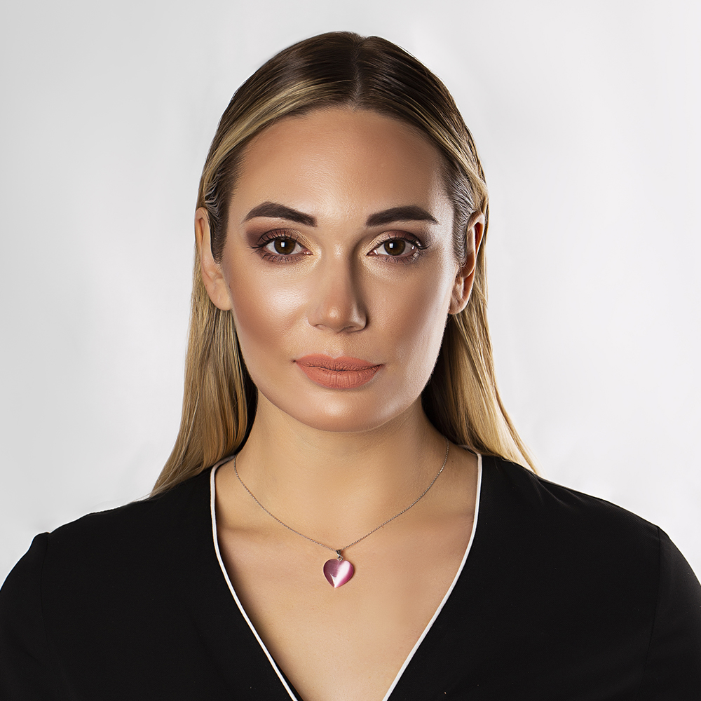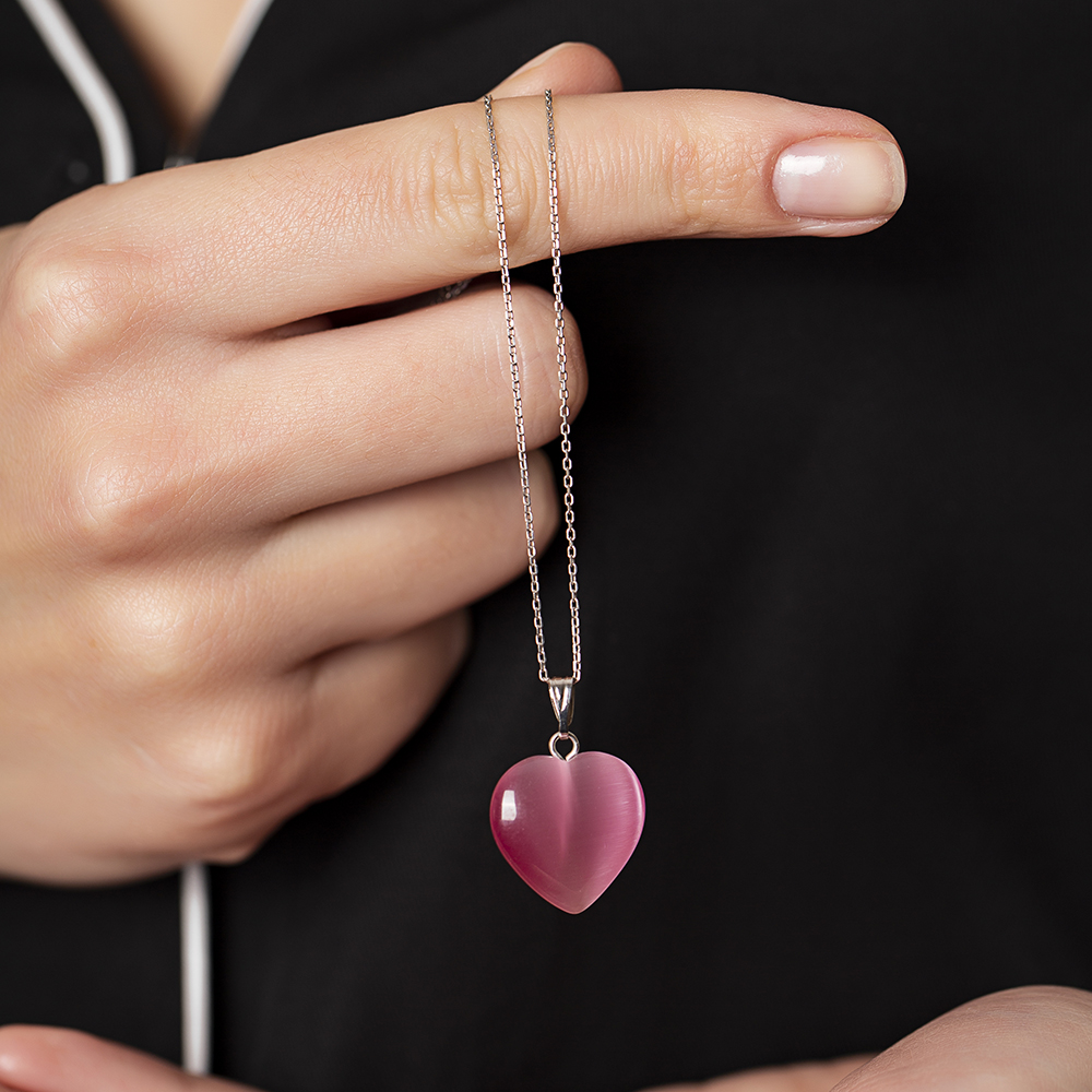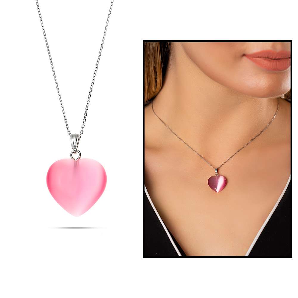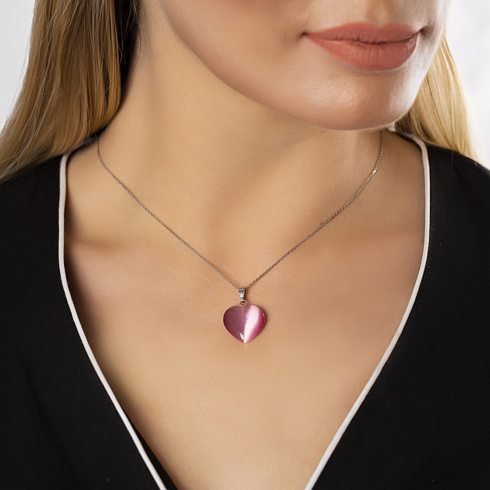 Kalp Tasarım 925 Ayar Gümüş Zincirli Çift Taraflı Fuşya Kedigözü Kolye