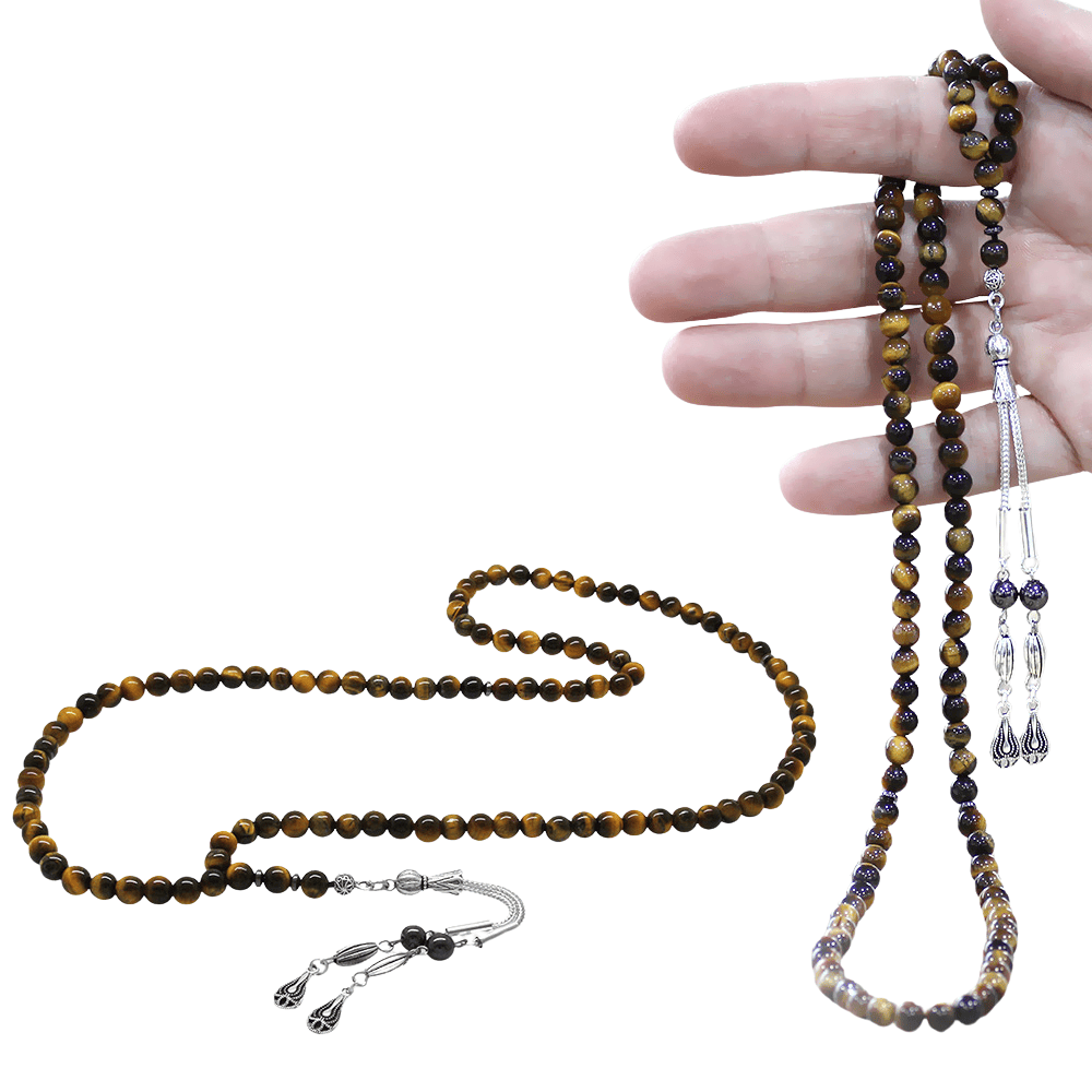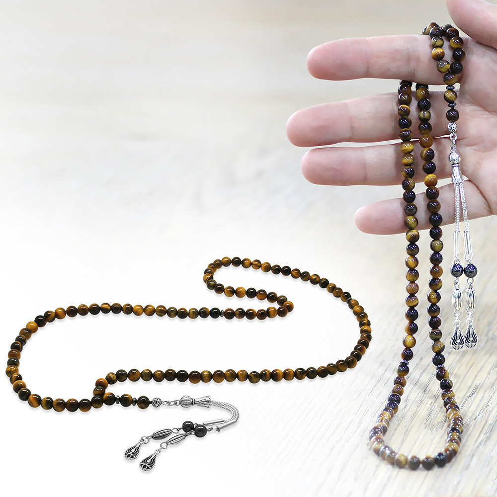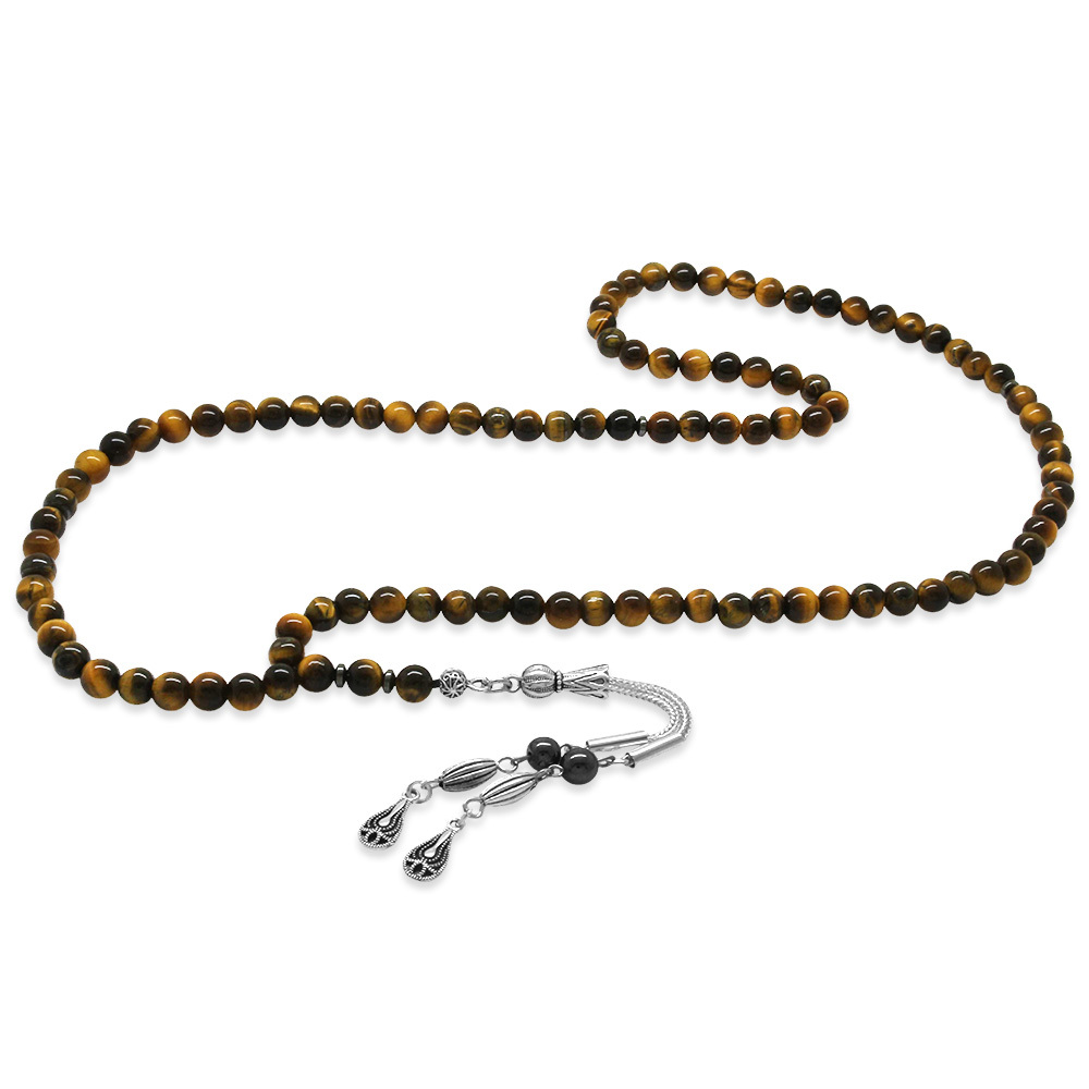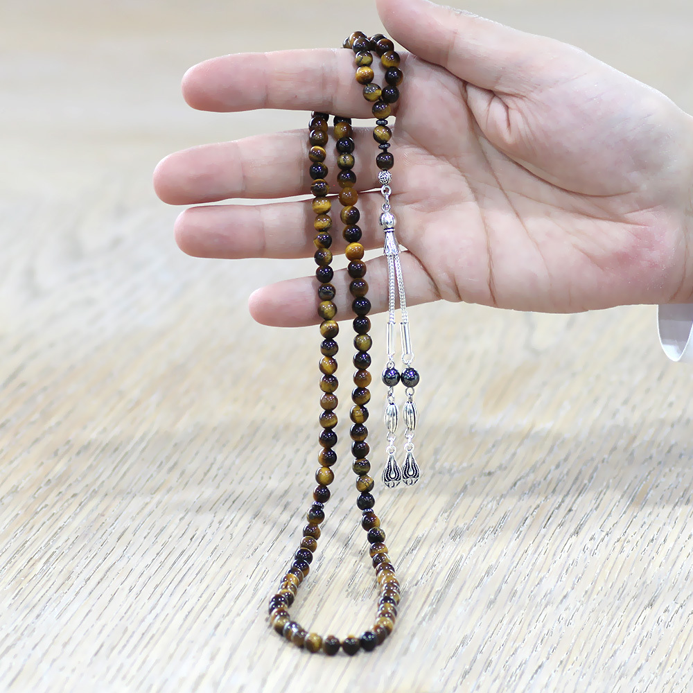 Kaplan Gözü Doğaltaş Namaz Tesbihi - Kararmaz Metal Damla Püsküllü - Kahverengi - Küre Kesim