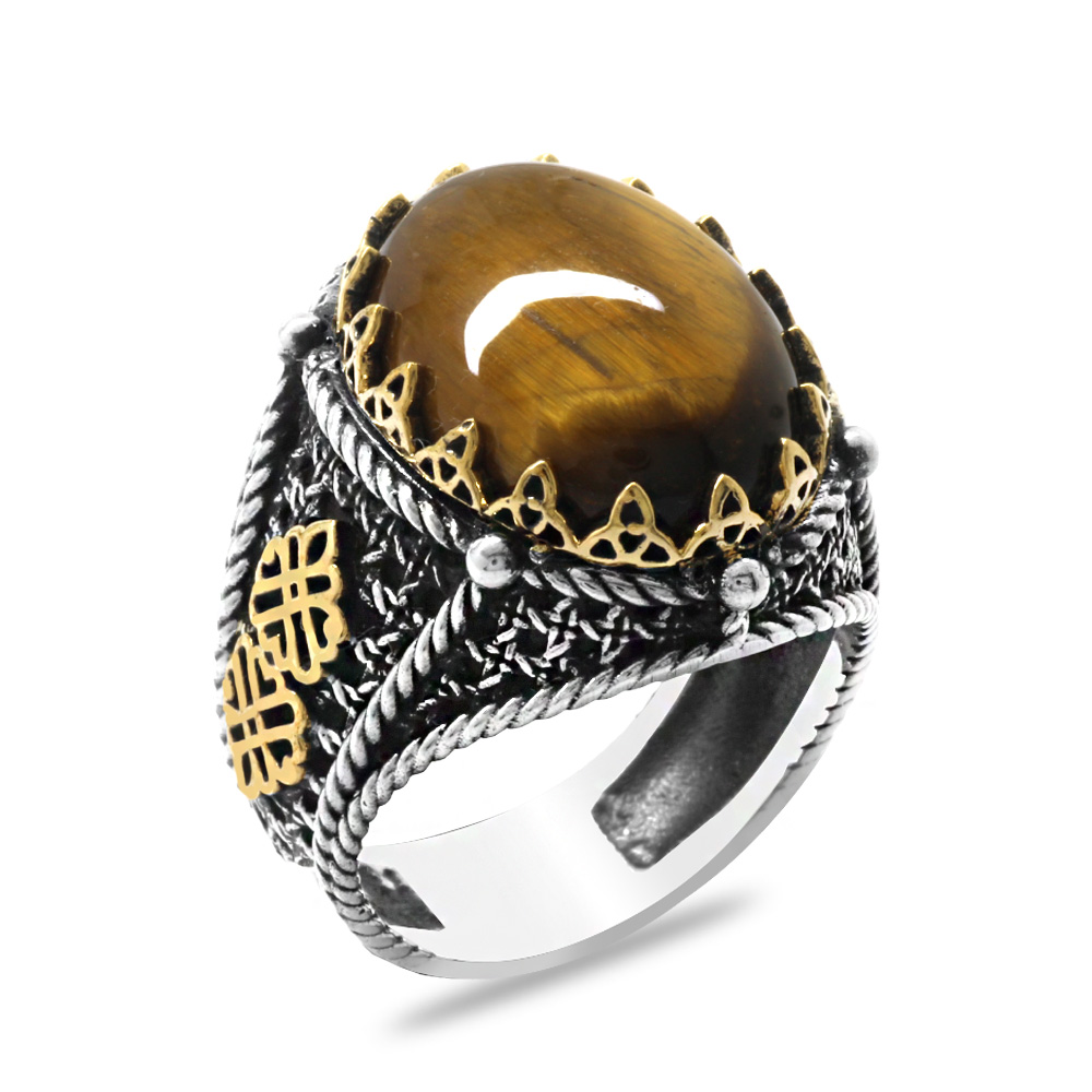 Kaplan Gözü Taşlı Kral Tacı Tasarım 925 Ayar Gümüş Erkek Yüzük