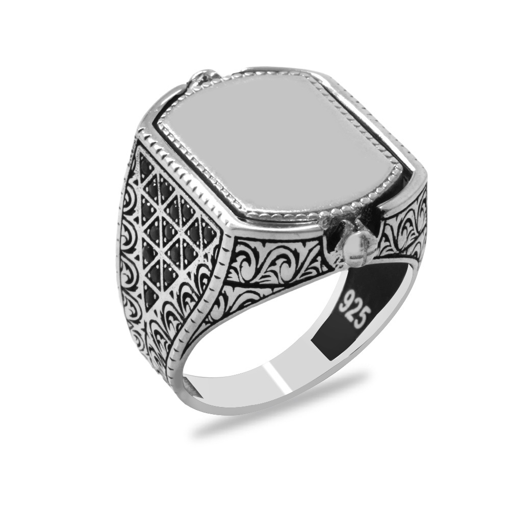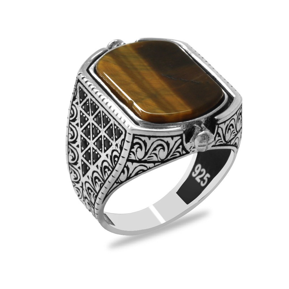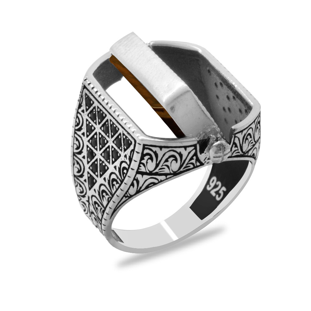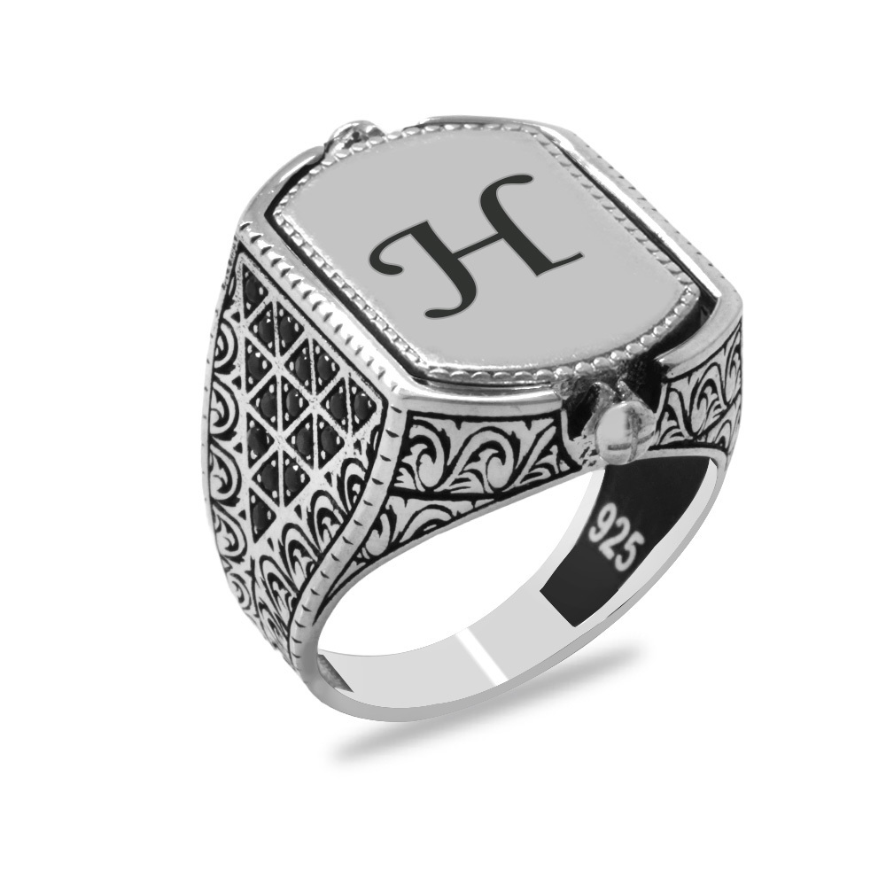 Kaplan Gözü ve Zirkon Taşlı Çift Taraflı İsme Özel Harf Yazılı 925 Ayar Gümüş Erkek Yüzük