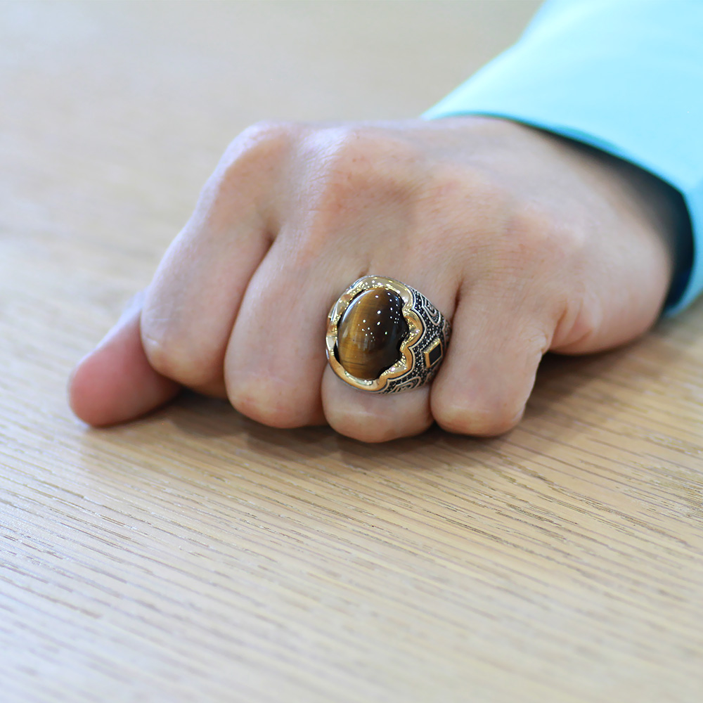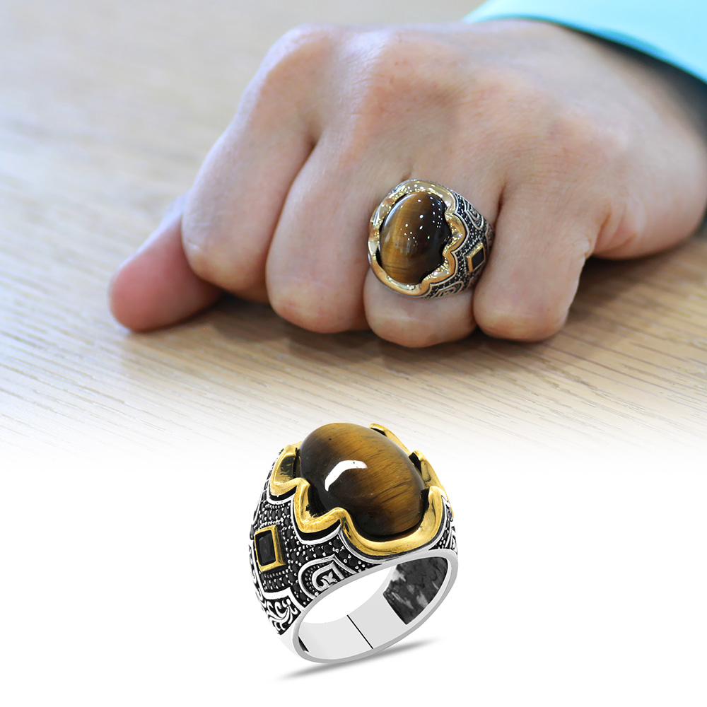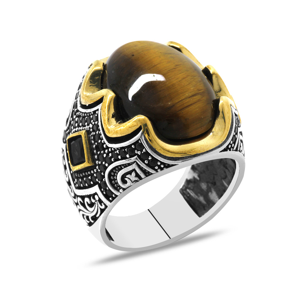 Kaplan Gözü Taşlı Yanları Gravür İşlemeli 925 Ayar Gümüş Erkek Yüzük