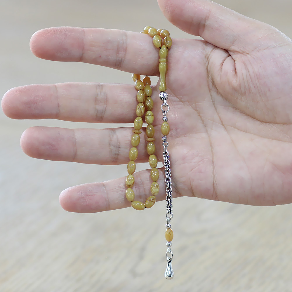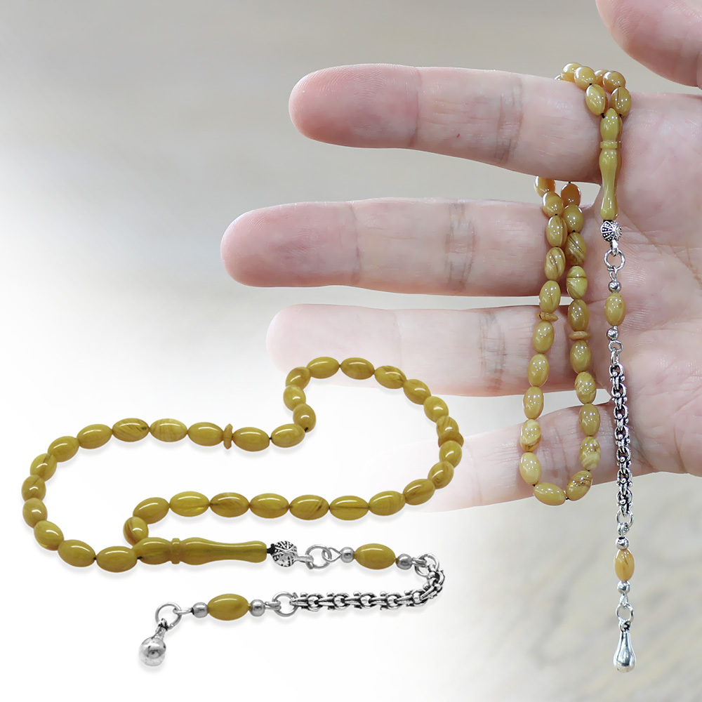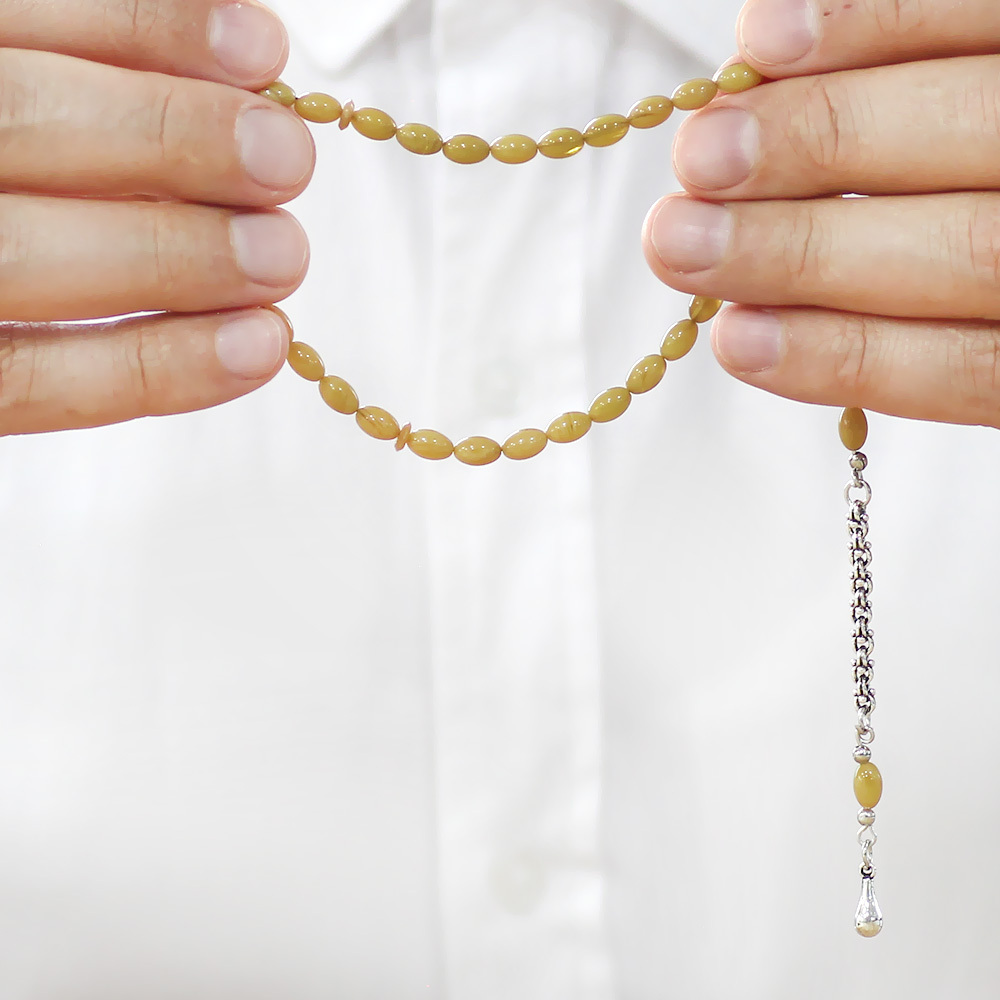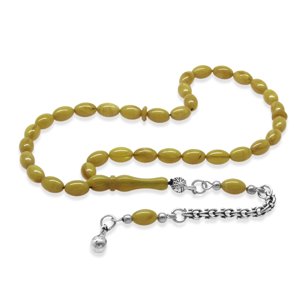 Kararmaz Metal Arnavut Zincir Püsküllü Arpa Kesim Hareli Sarı Mini Boy Ateş Kehribar Tesbih