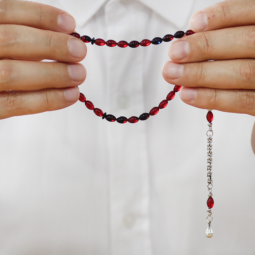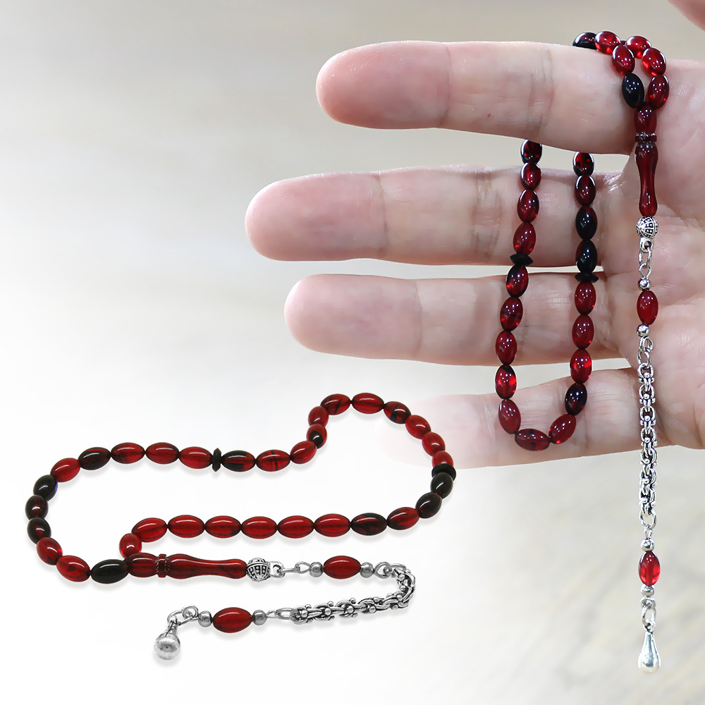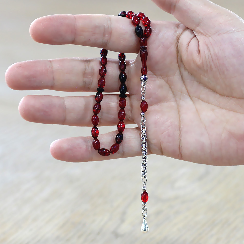 Ateş Kehribar Tesbih - Kararmaz Metal Arnavut Püsküllü - Mini Boy - Kırmızı Siyah - Arpa Kesim