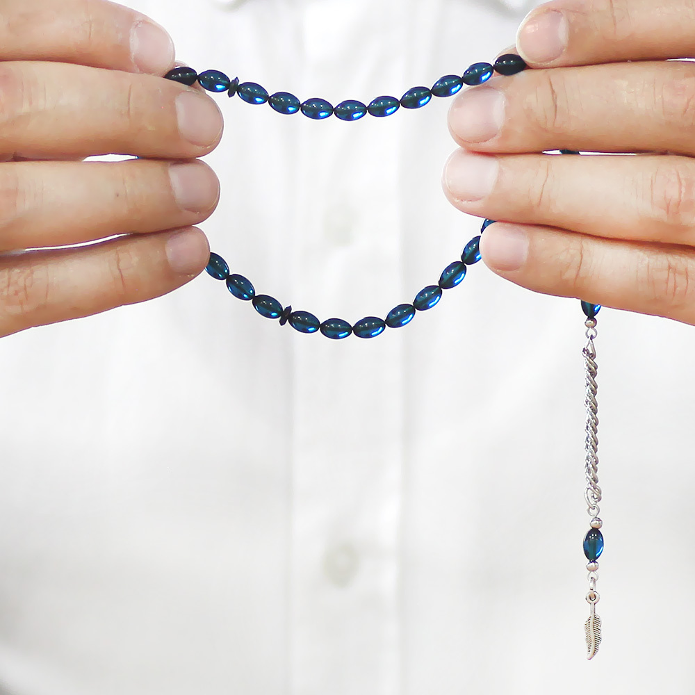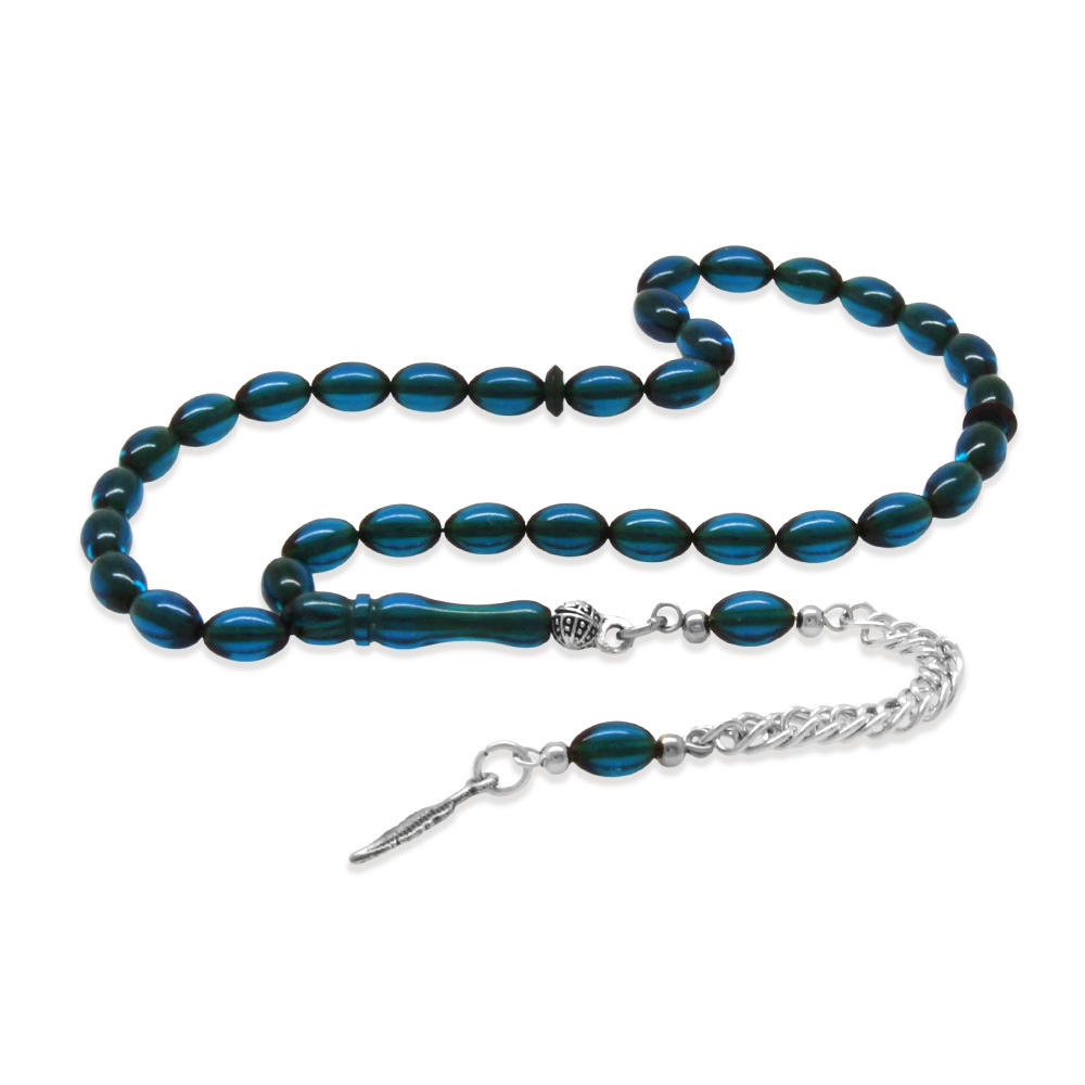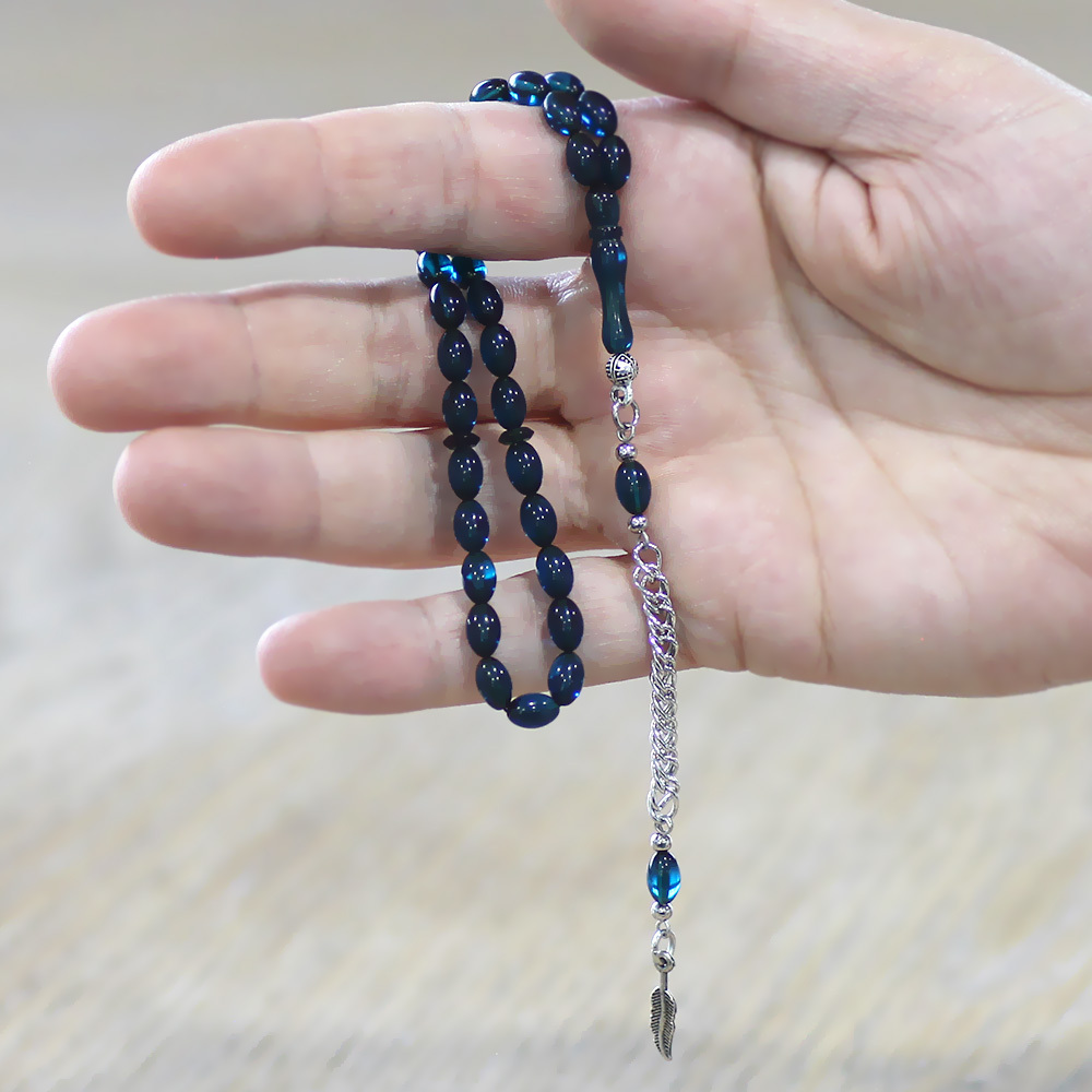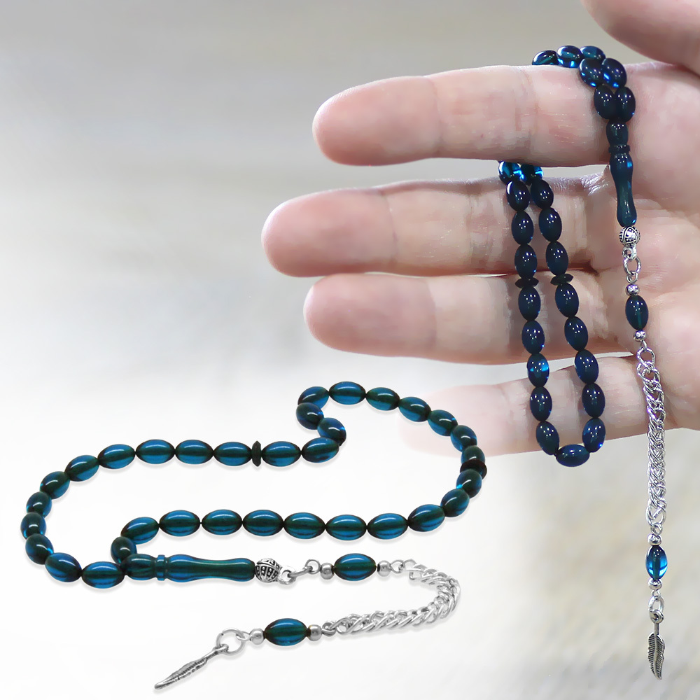 Sıkma Kehribar Tesbih - Kararmaz Metal Püsküllü - Mini Boy - Lacivert Renk - Arpa Kesim