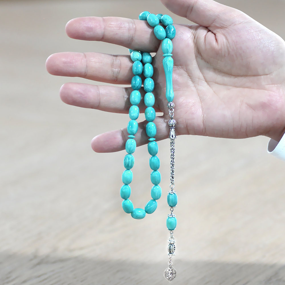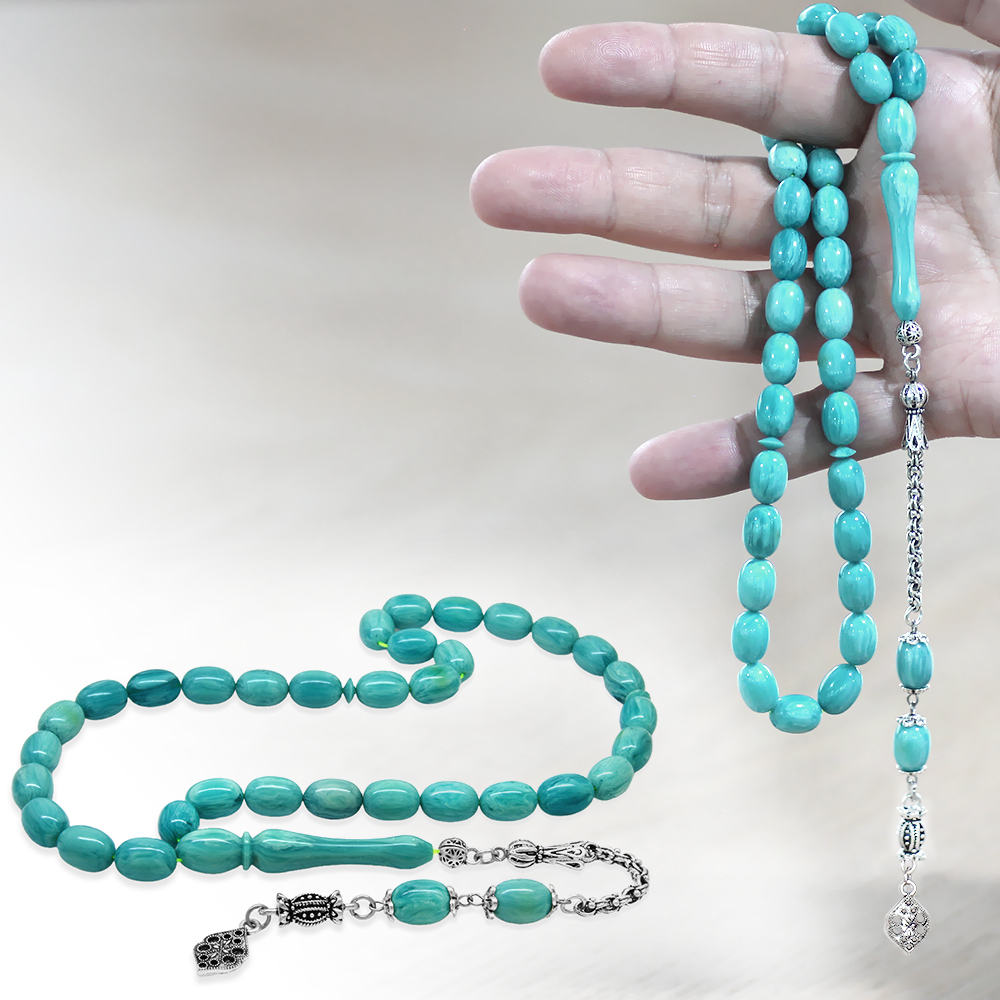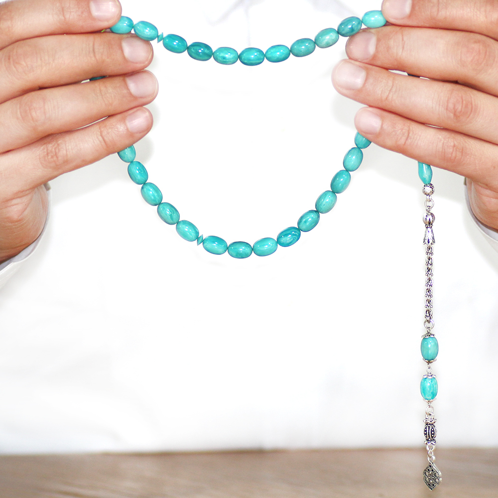 Kararmaz Metal Arnavut Zincir Püsküllü Sülün İmame Beyzi Kesim Turkuaz - Beyaz Hareli Katalin Tesbih