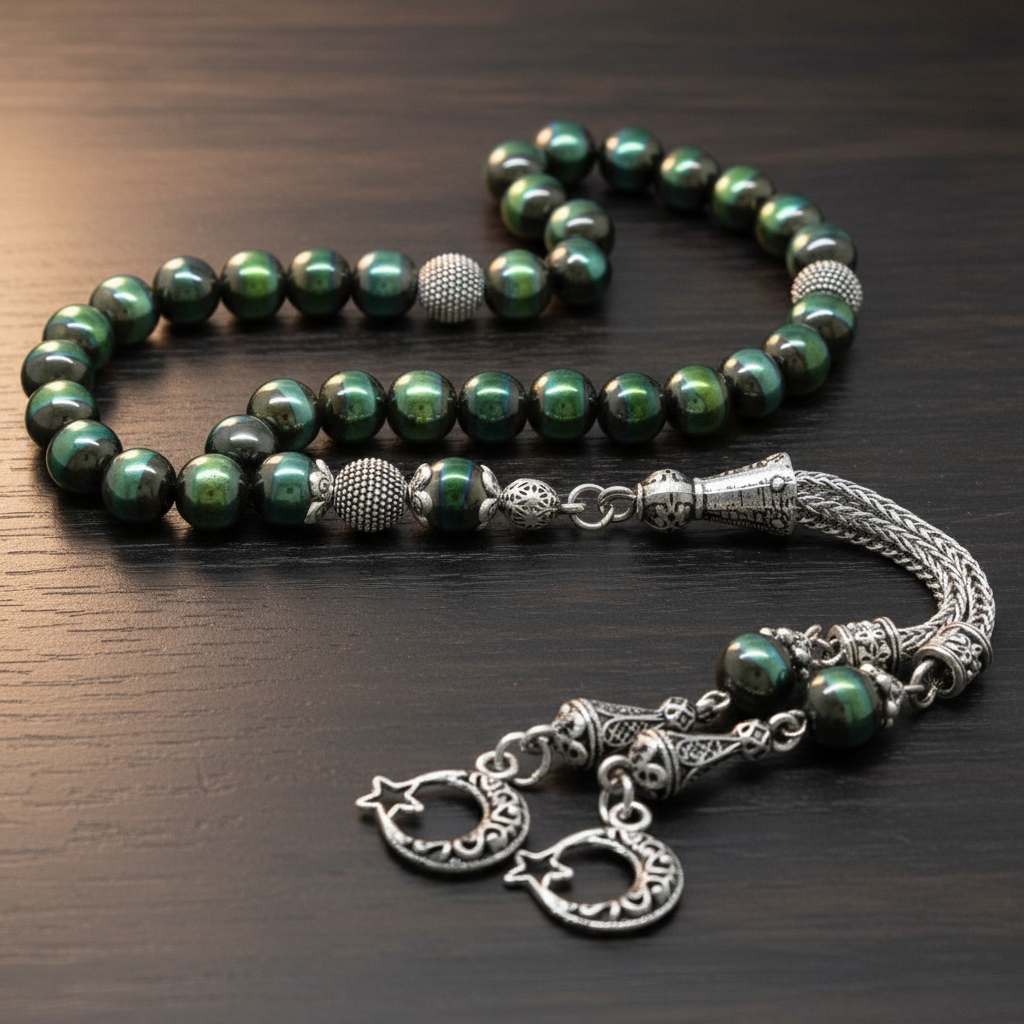 Kararmaz Metal Ayyıldız Püsküllü Küre Kesim Renkli Hematit Doğaltaş Tesbih