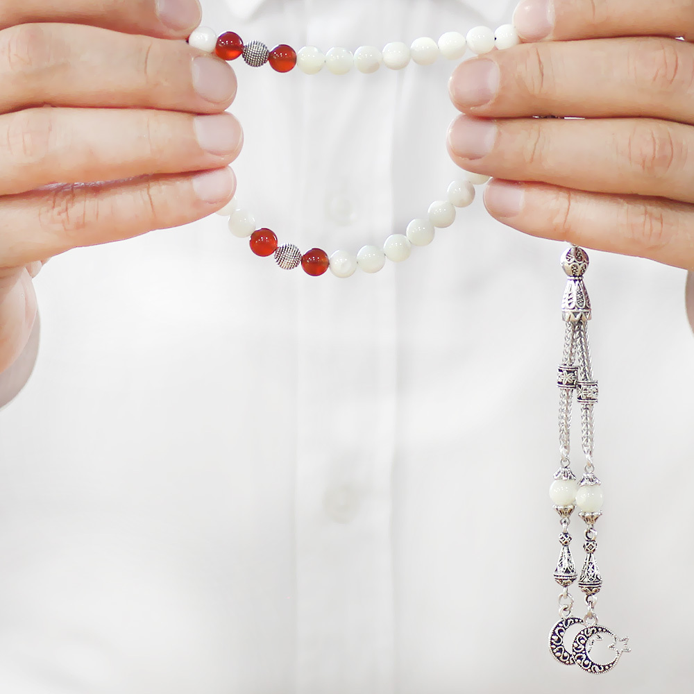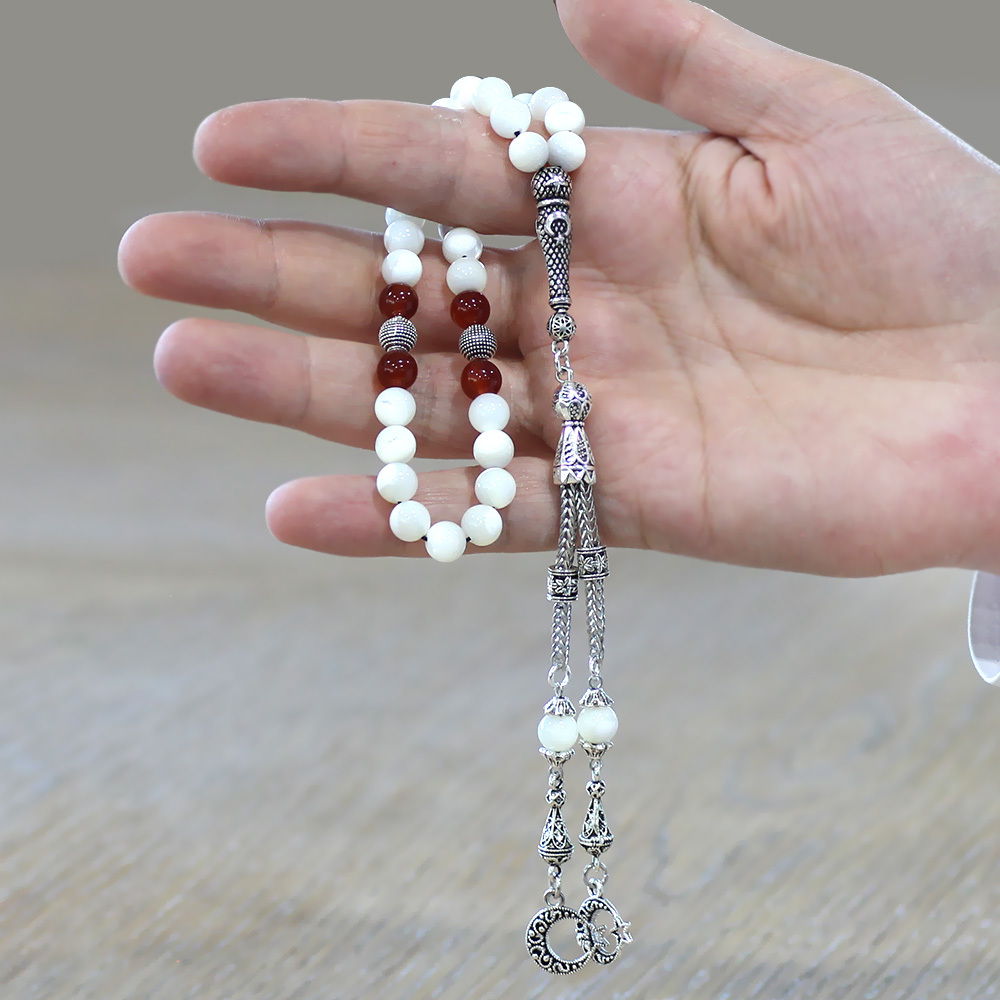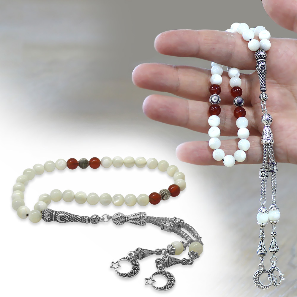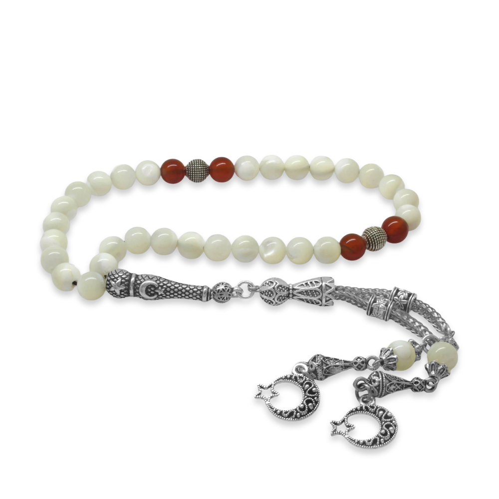 Kararmaz Metal Ayyıldız Püsküllü Küre Kesim Sedef Mercan Doğaltaş Tesbih