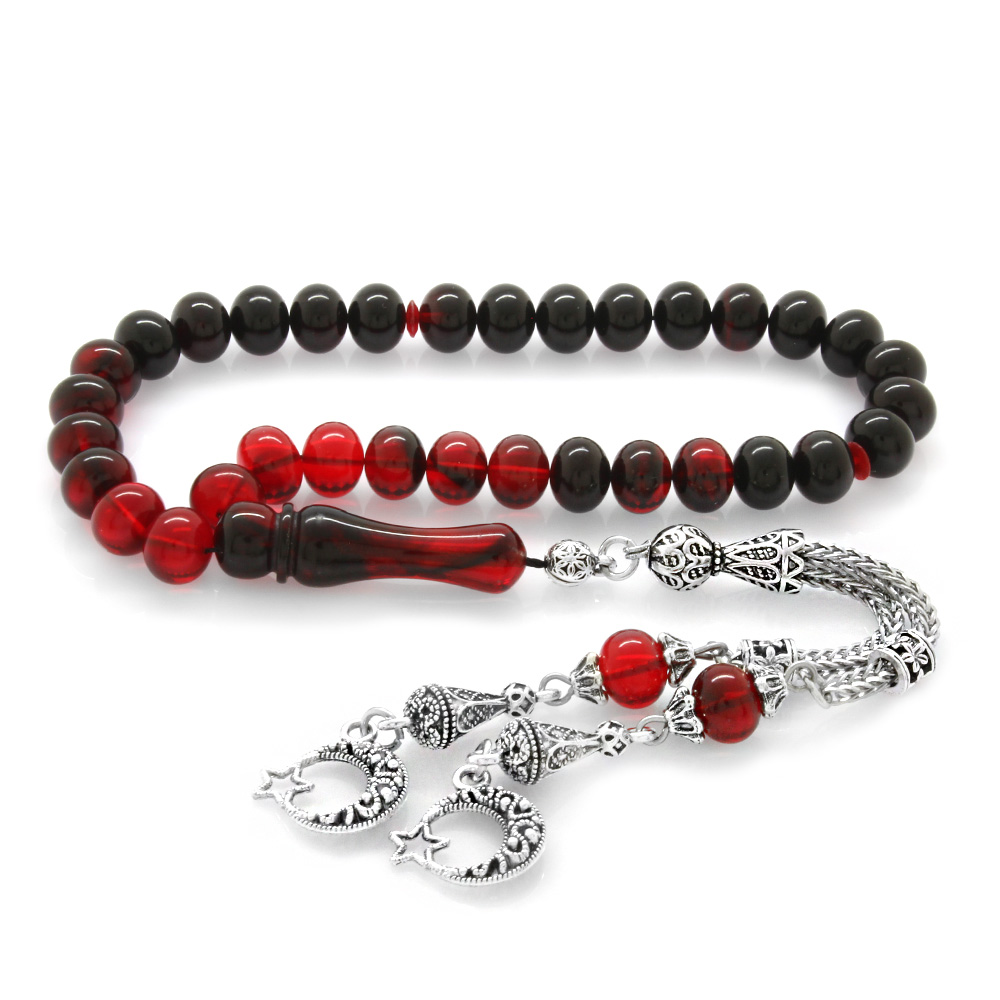 Kararmaz Metal Ayyıldız Püsküllü Tekerlek Kesim Süzme Kırmızı Siyah Ateş Kehribar Tesbih - 1