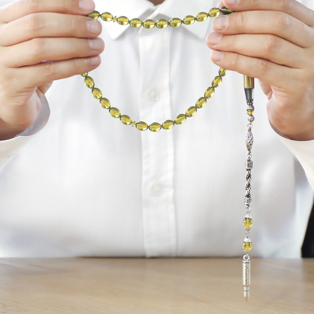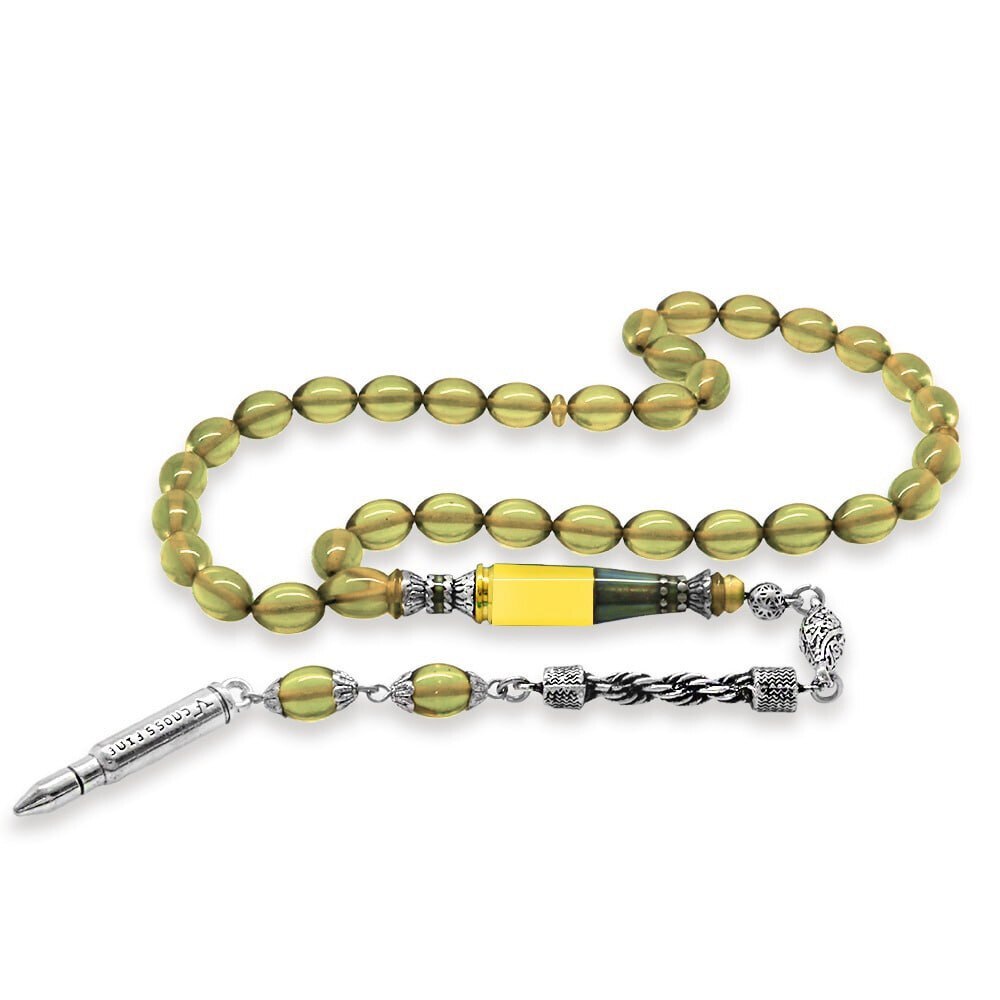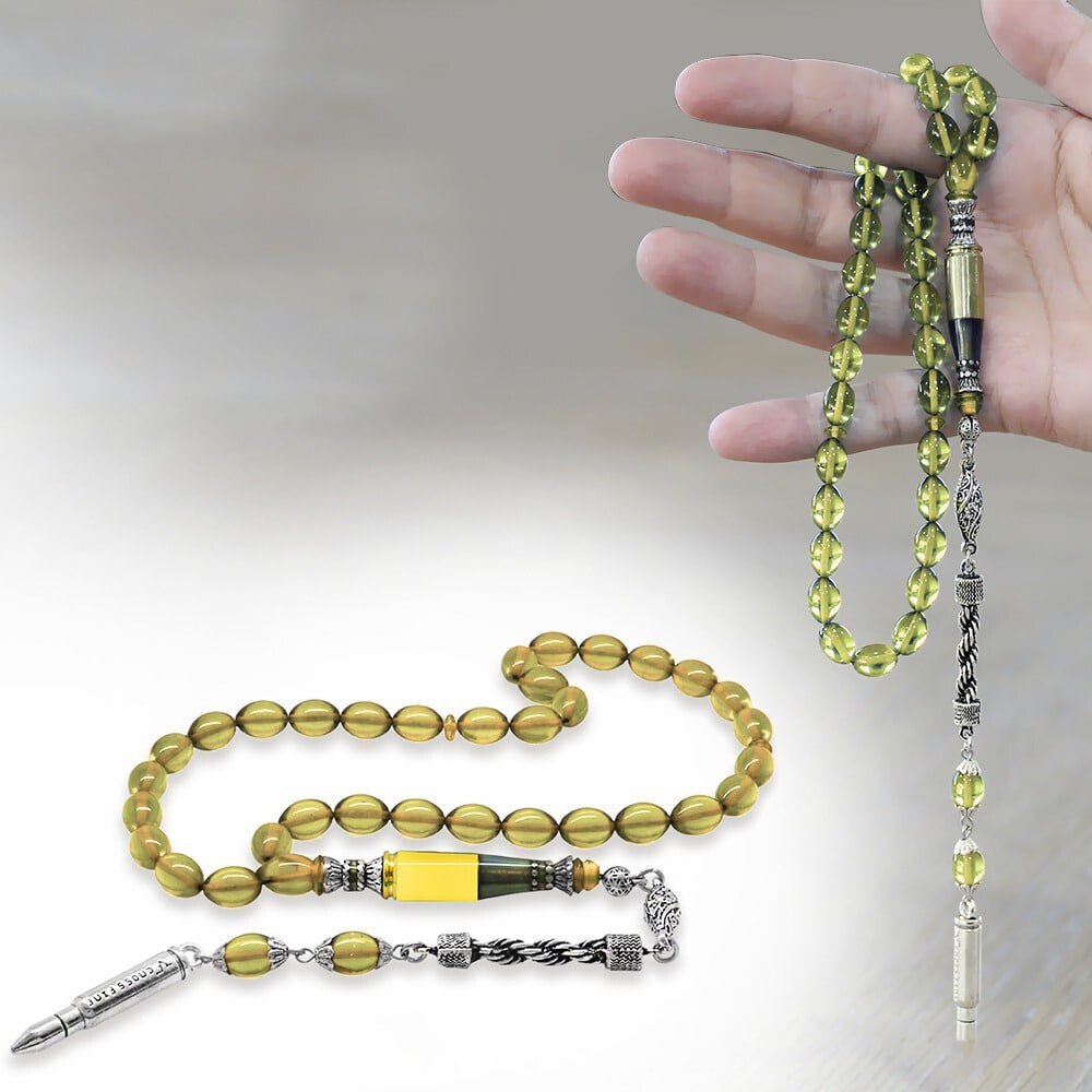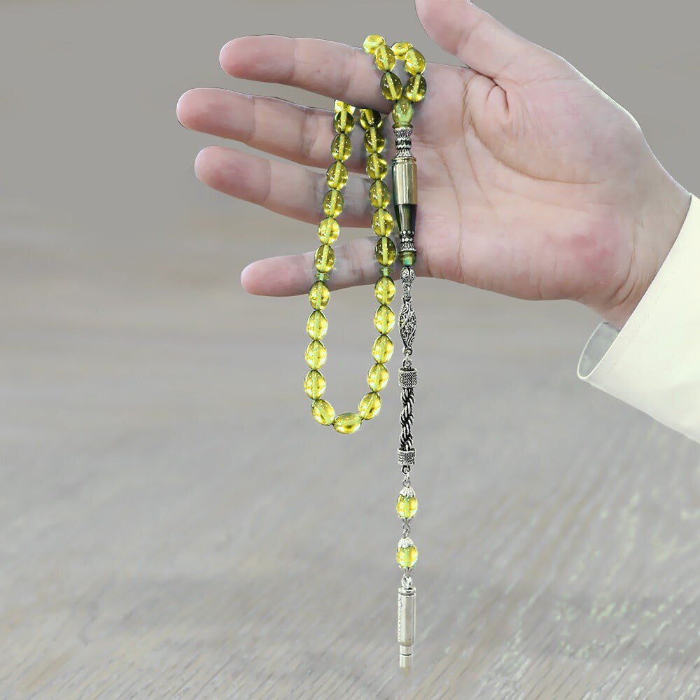 Kararmaz Metal Halat Püsküllü Kurşun Nakkaş İmameli Arpa Kesim Şeffaf Sarı Ateş Kehribar Tesbih