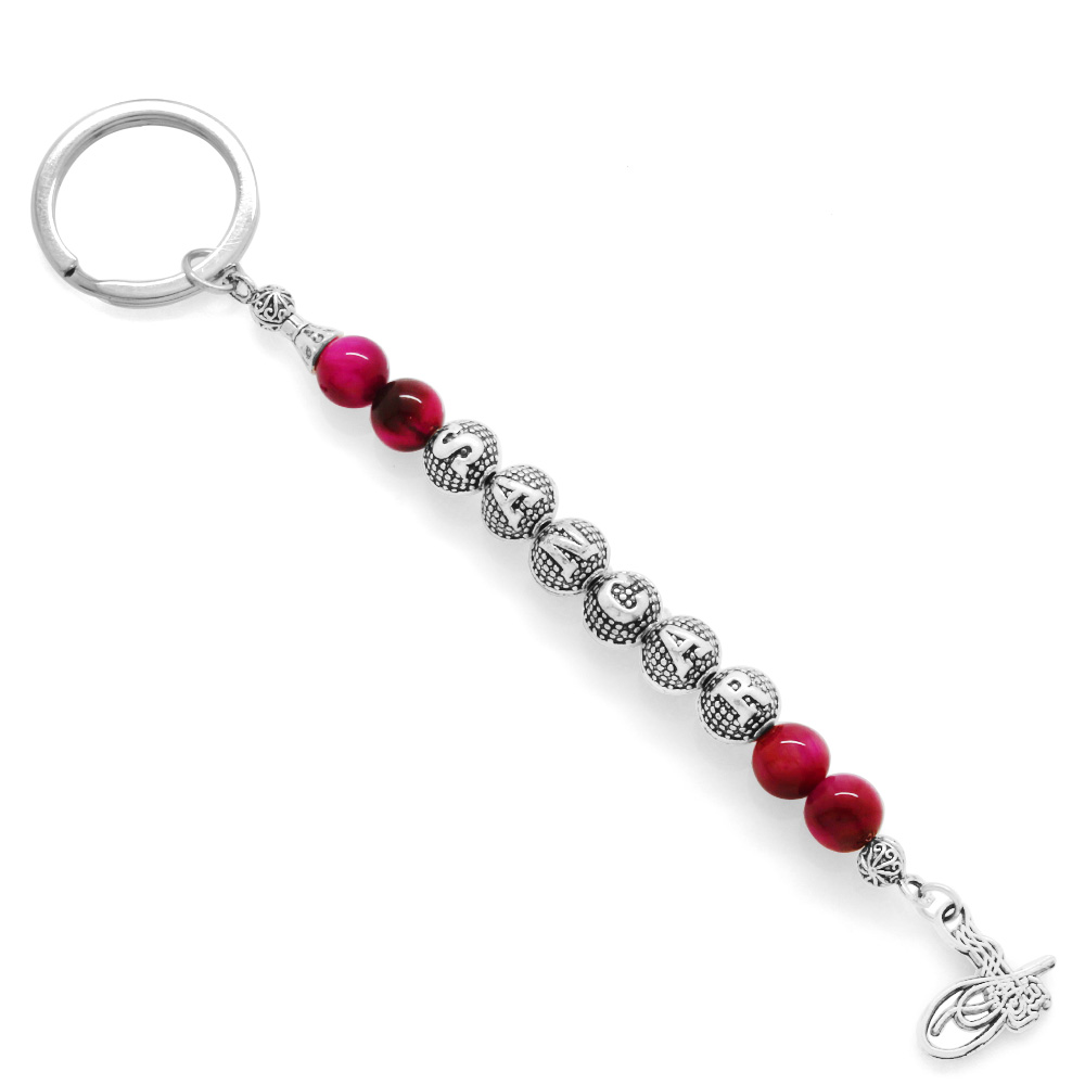 Kararmaz Metal İsme Özel Yazılı Fuşya Kaplan Gözü Doğaltaş ve Çelik Bileşim Anahtarlık