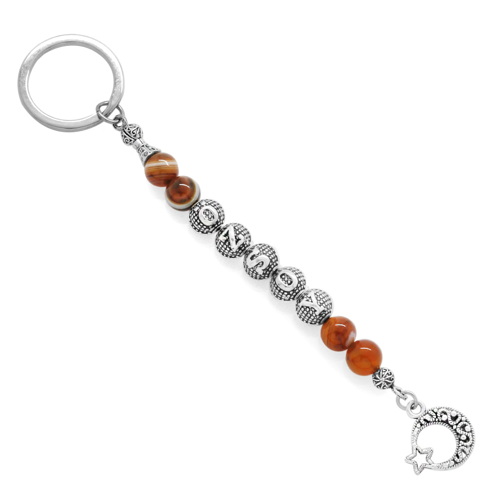 Kararmaz Metal İsme Özel Yazılı Kırmızı Siyah Akik Doğaltaş Çelik Kombinli Anahtarlık
