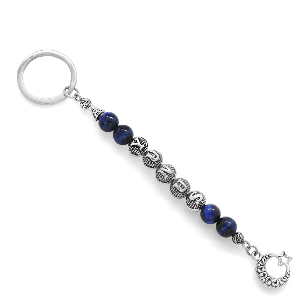 Kararmaz Metal İsme Özel Yazılı Mavi Kaplan Gözü Doğaltaş ve Çelik Bileşim Anahtarlık