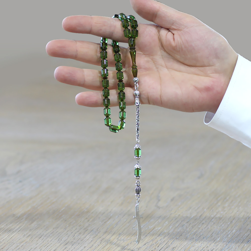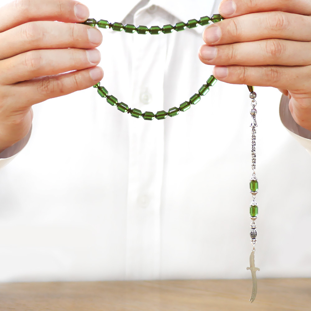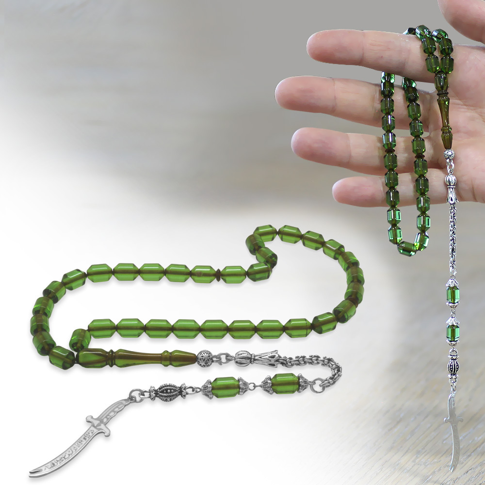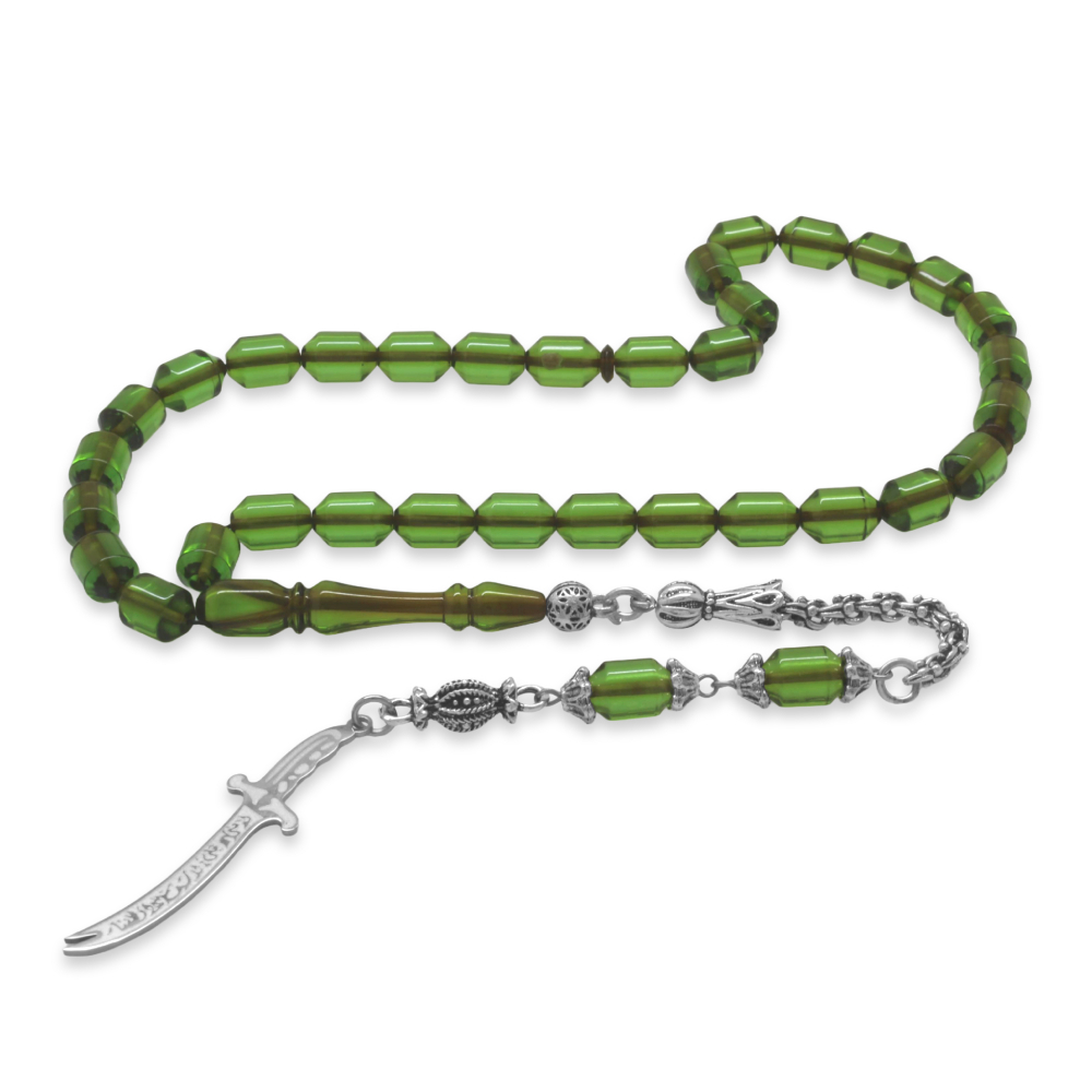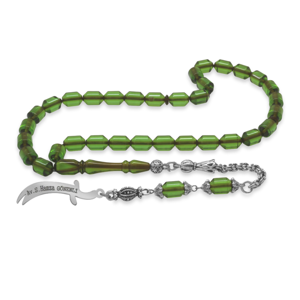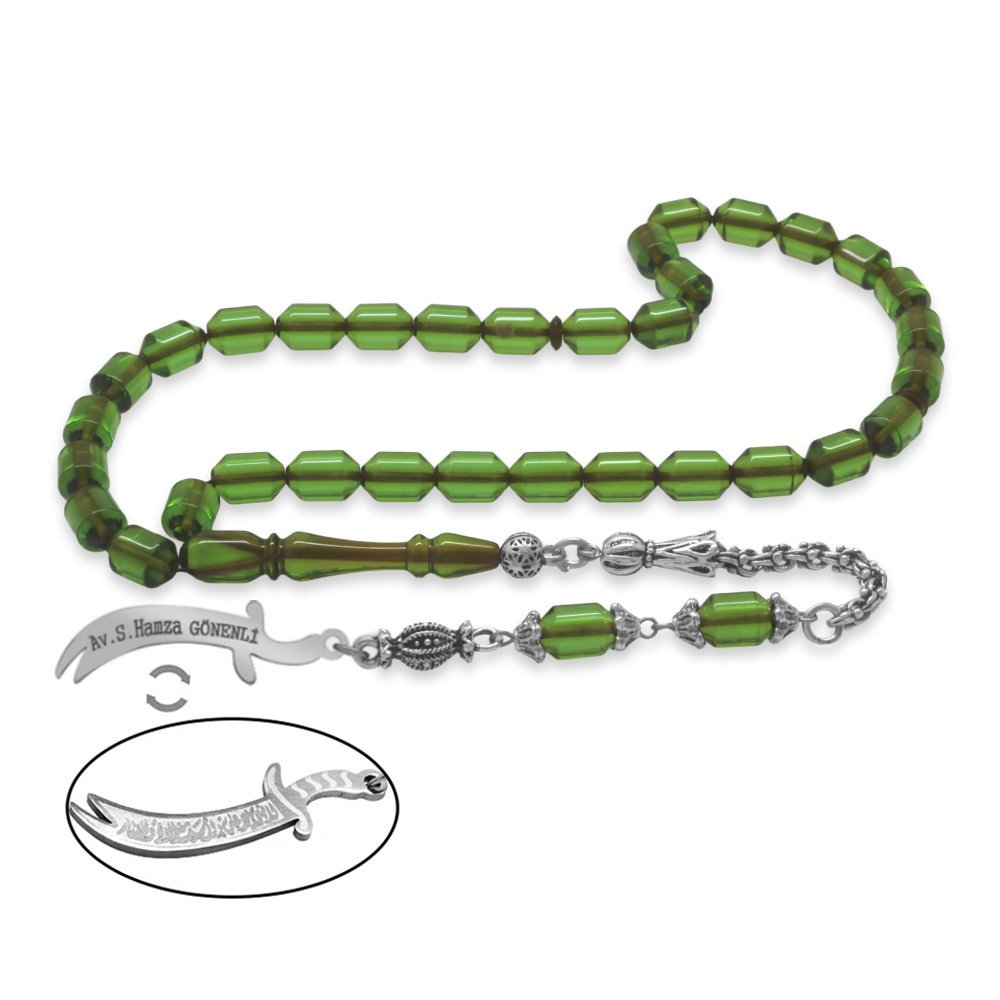 Kararmaz Metal Püsküllü Elmas Kesim İsim Yazılı Zülfikar Plakalı Su Yeşil Ateş Kehribar Tesbih