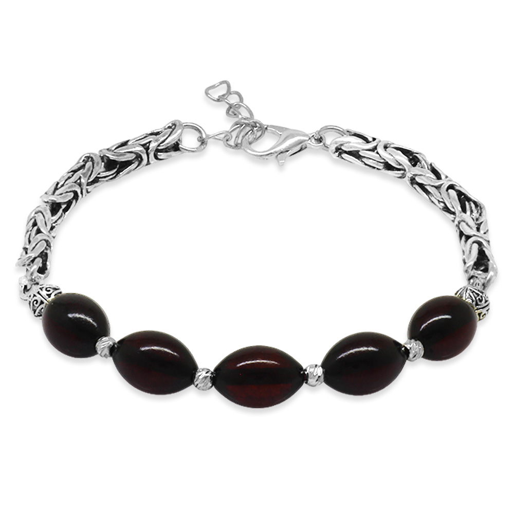 Kararmaz Metal Kralli Arpa Kesim Dorika Top Süslemeli Koyu Kırmızı Damla Kehribar Erkek Bileklik