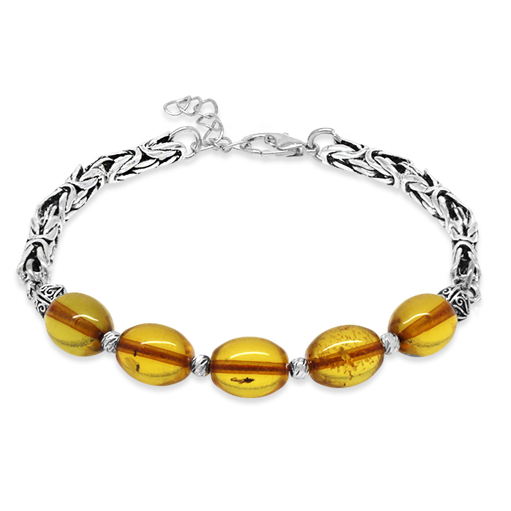 Kararmaz Metal Kral Zincirli Dorika Top Süslemeli Bal Rengi Damla Kehribar Erkek Bileklik - 1