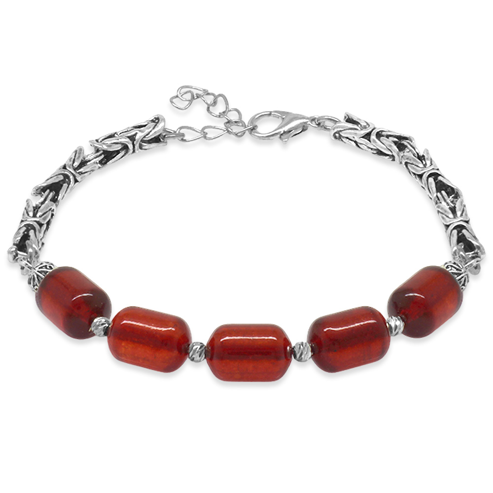 Kararmaz Metal Kralli Kapsül Kesim Dorika Top Süslemeli Bayrak Kırmızı Damla Kehribar Erkek Bileklik