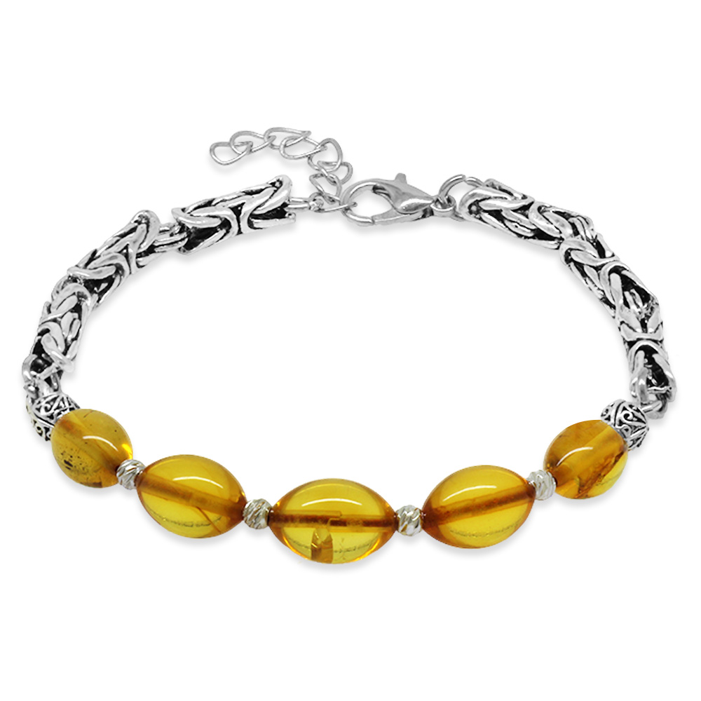 Kararmaz Metal Kral Zincirli Gümüş Renk Dorika Top Süslemeli Bal Rengi Damla Kehribar Erkek Bileklik - 1