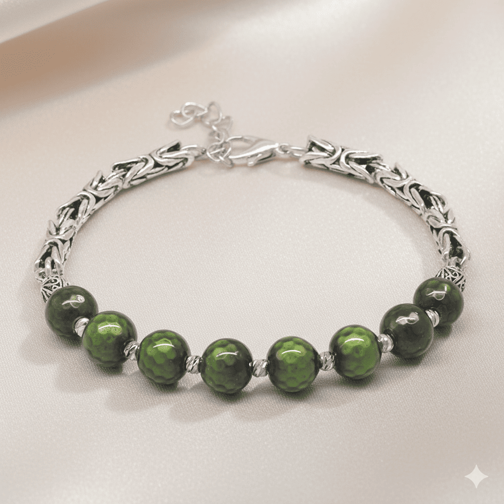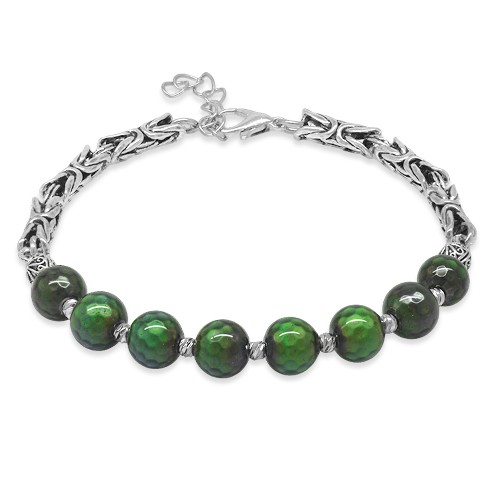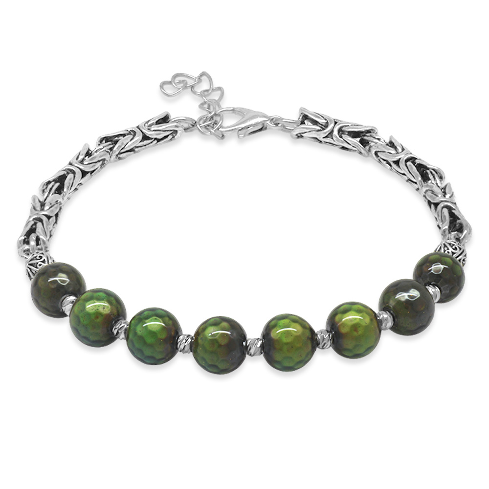 Kararmaz Metal Kralli Gümüş Renk Dorika Top Süslemeli Küre Kesim Fasetalı His Taşı Erkek Bileklik