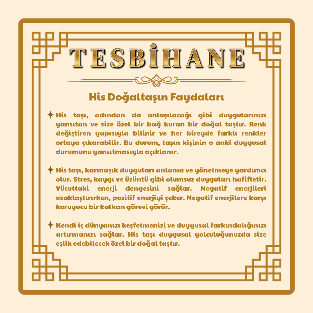 His taşı, adından da anlaşılacağı gibi duygularınızı yansıtan ve size özel bir bağ kuran bir doğal taştır. Renk değiştiren yapısıyla bilinir ve her bireyde farklı renkler ortaya çıkarabilir. Bu durum, taşın kişinin o anki duygusal durumunu yansıtmasıyla açıklanır. His taşı, karmaşık duyguları anlama ve yönetmeye yardımcı olur. Stres, kaygı ve üzüntü gibi olumsuz duyguları hafifletir. Vücuttaki enerji dengesini sağlar. Negatif enerjileri uzaklaştırırken, pozitif enerjiyi çeker. Negatif enerjilere karşı koruyucu bir kalkan görevi görür. Kendi iç dünyanızı keşfetmenizi ve duygusal farkındalığınızı artırmanızı sağlar. His taşı duygusal yolculuğunuzda size eşlik edebilecek özel bir doğal taştır.