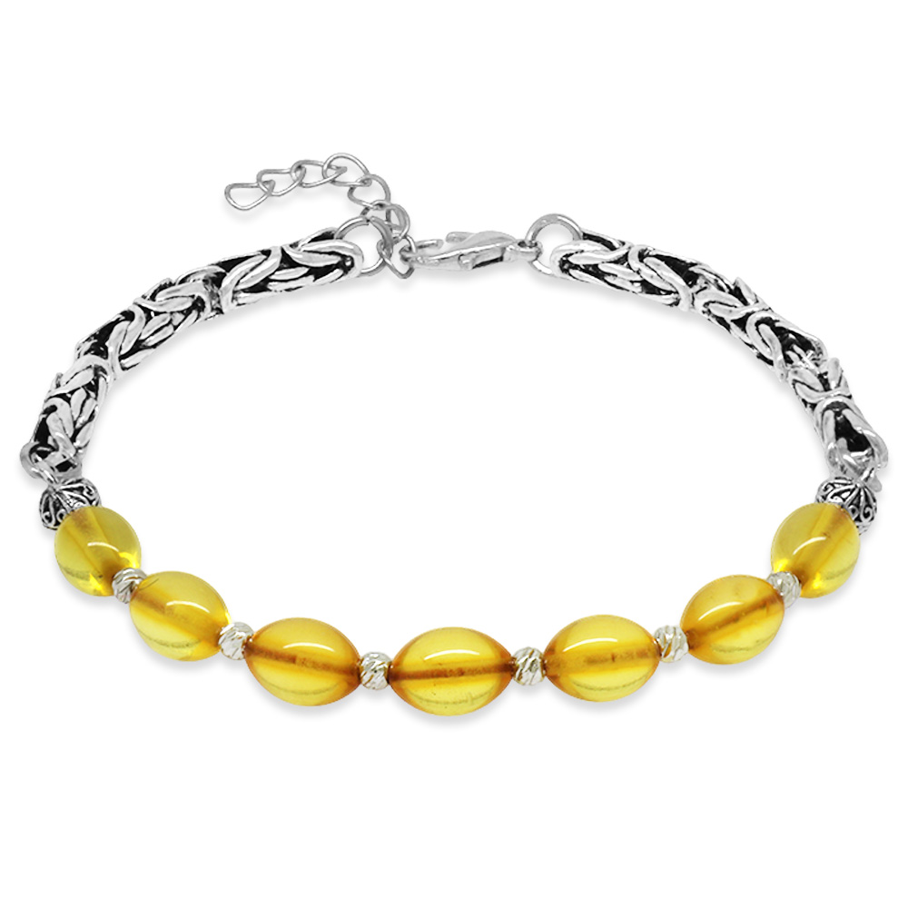 Kararmaz Metal Kral Zincirli Gümüş Renk Dorika Top Süslemeli Sarı Damla Kehribar Erkek Bileklik - 1