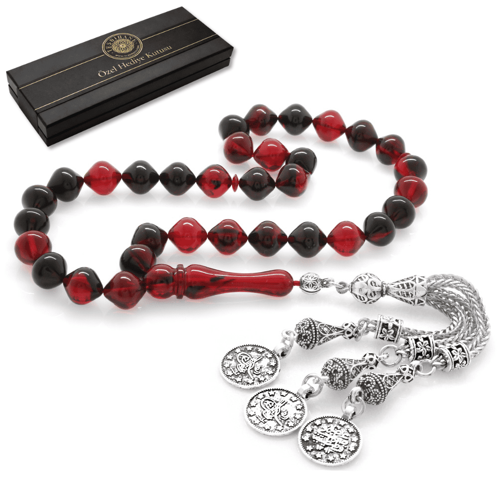 Kararmaz Metal Mecidiye Püsküllü İstanbul Kesim Kırmızı Siyah Ateş Kehribar Tesbih