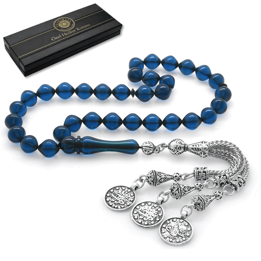 Kararmaz Metal Mecidiye Püsküllü İstanbul Kesim Lacivert Sıkma Kehribar Tesbih - 1
