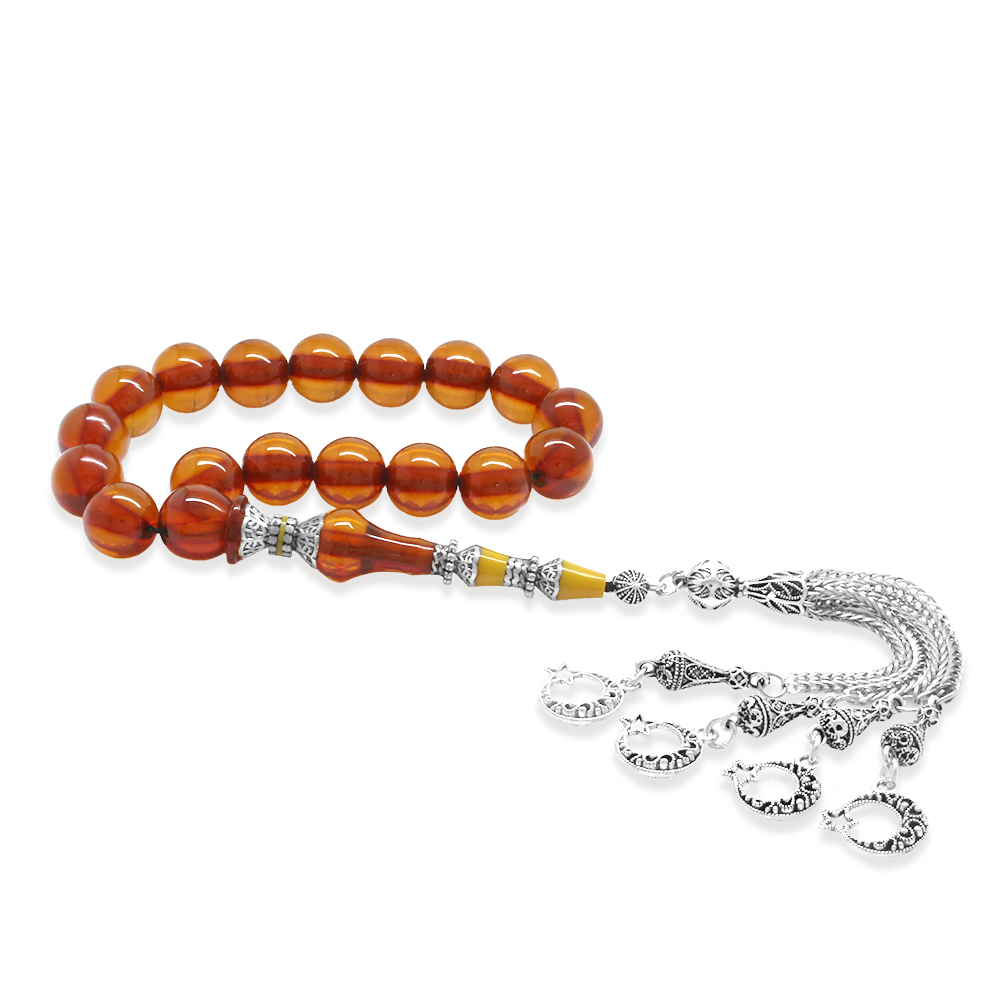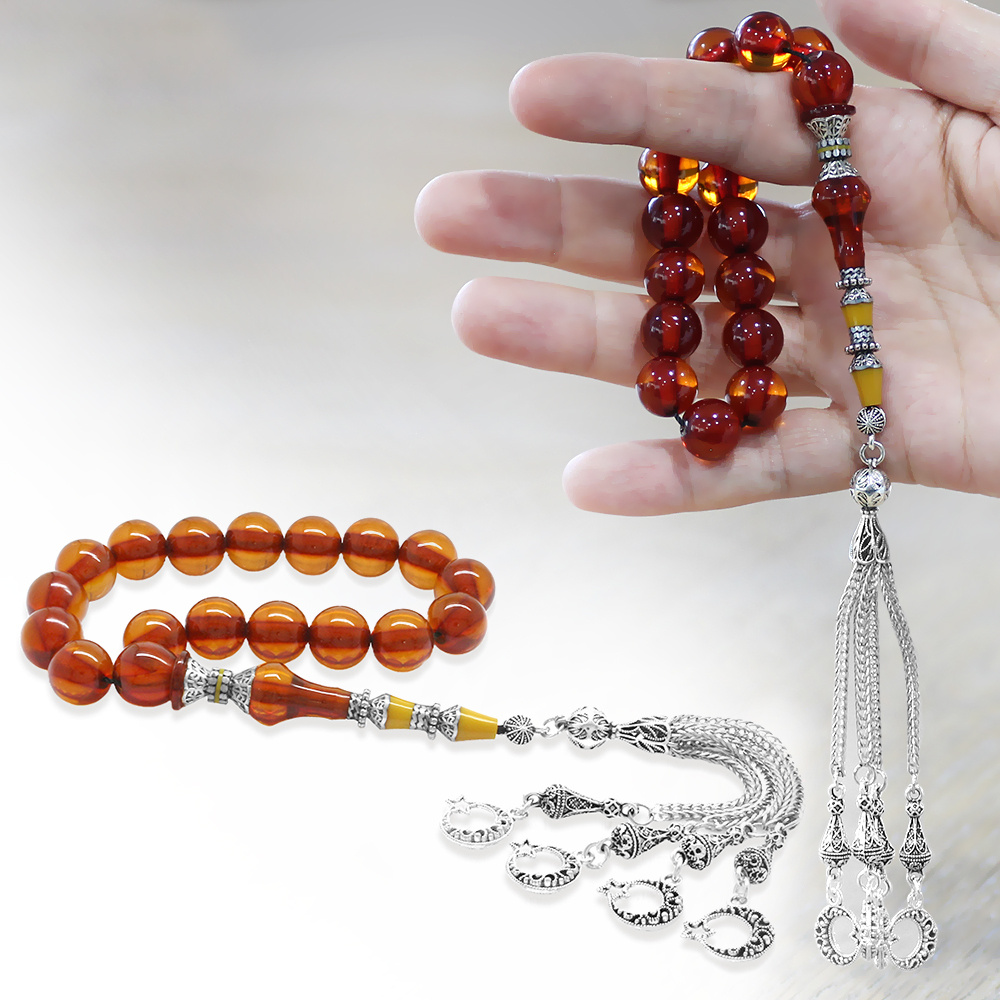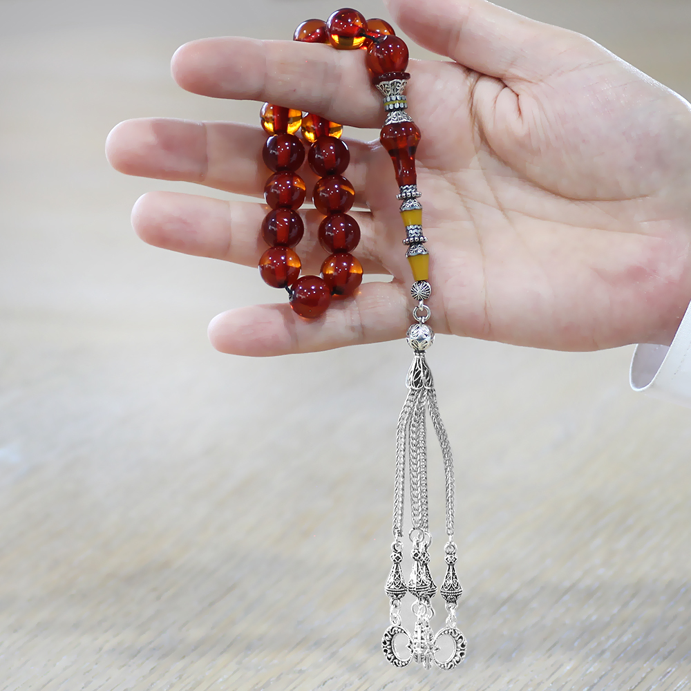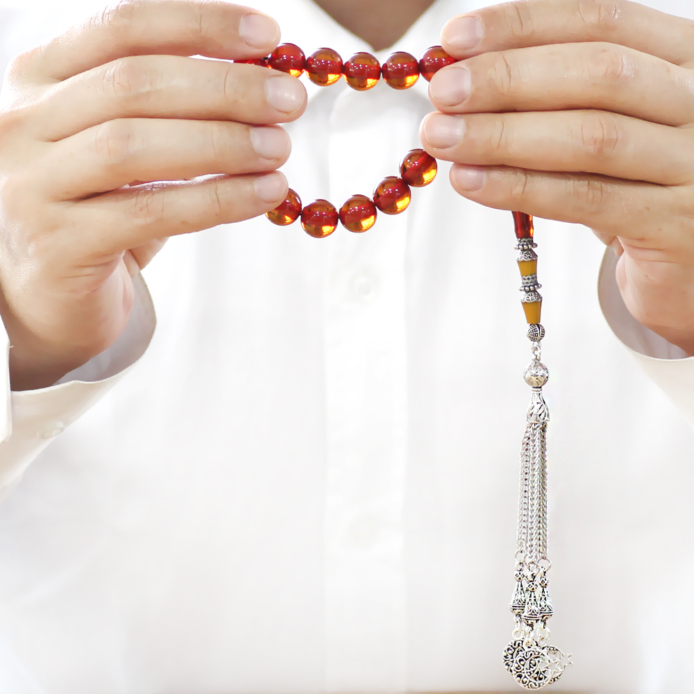 Kararmaz Metal Püsküllü Alpaka Nakkaş İmameli Kırmızı Sıkma Kehribar Efe Tesbih Küre Kesim