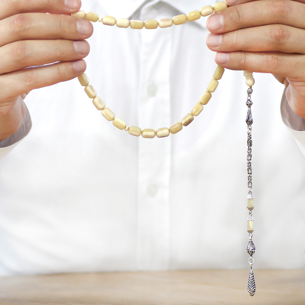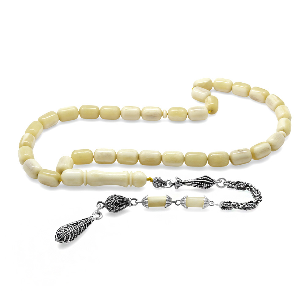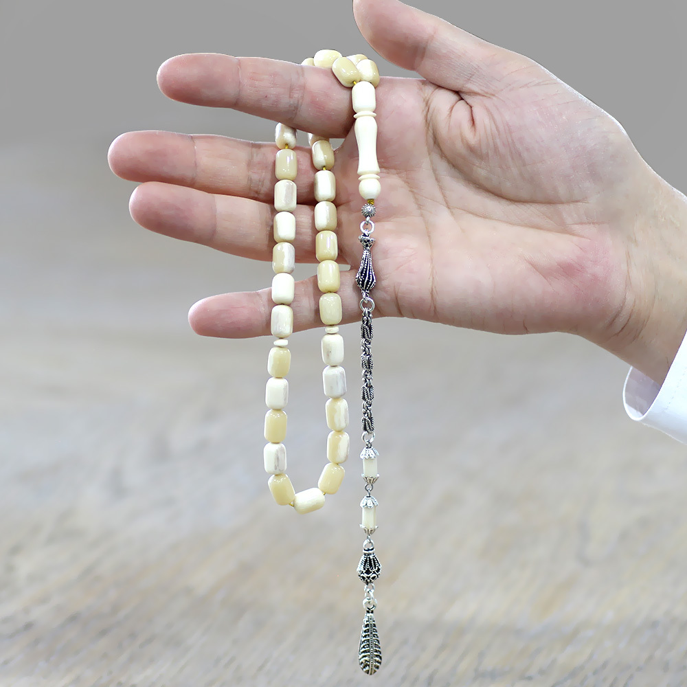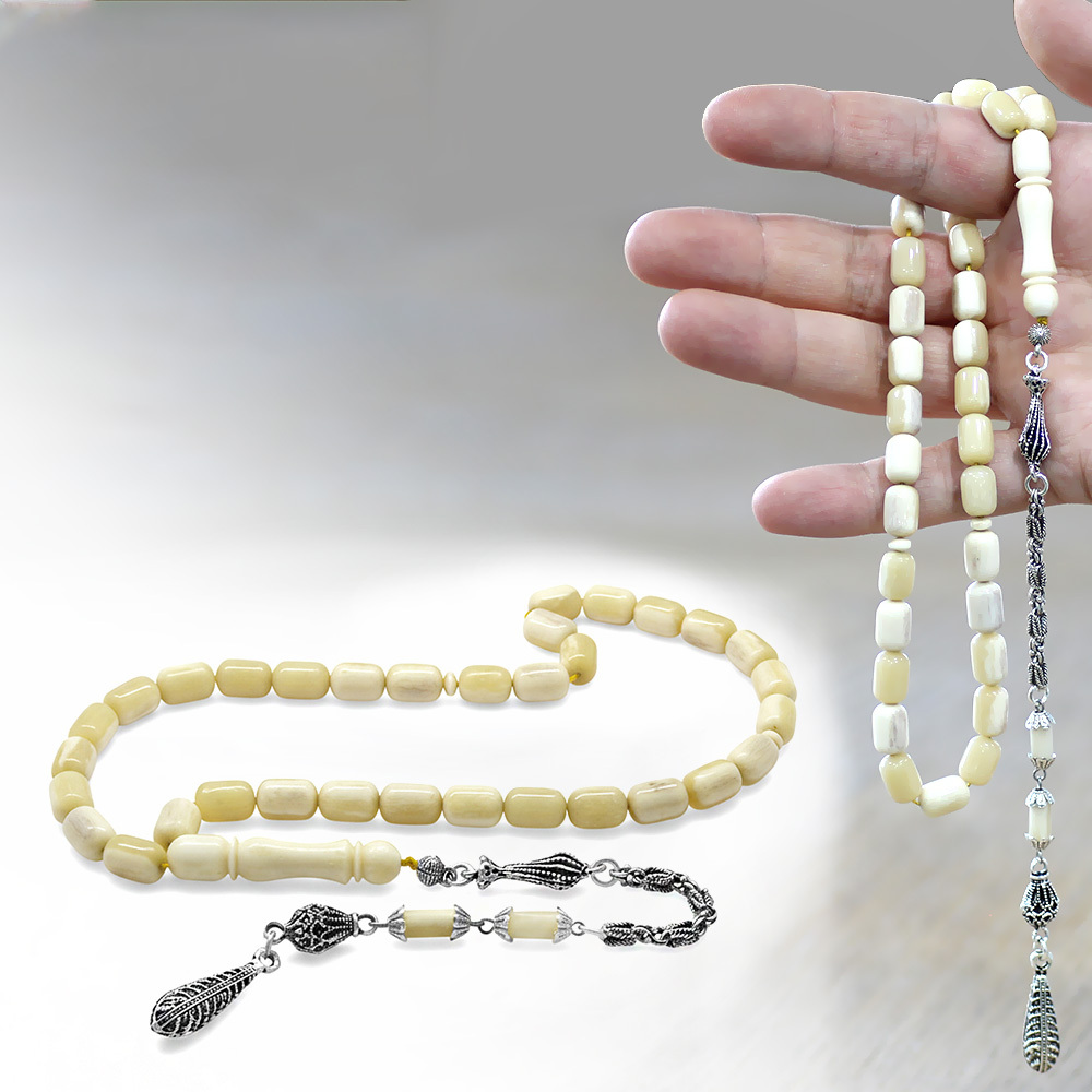 Kararmaz Metal Püsküllü İmamesi İşçilikli Kapsül Kesim Doğal Renk Deve Kemiği Tesbih