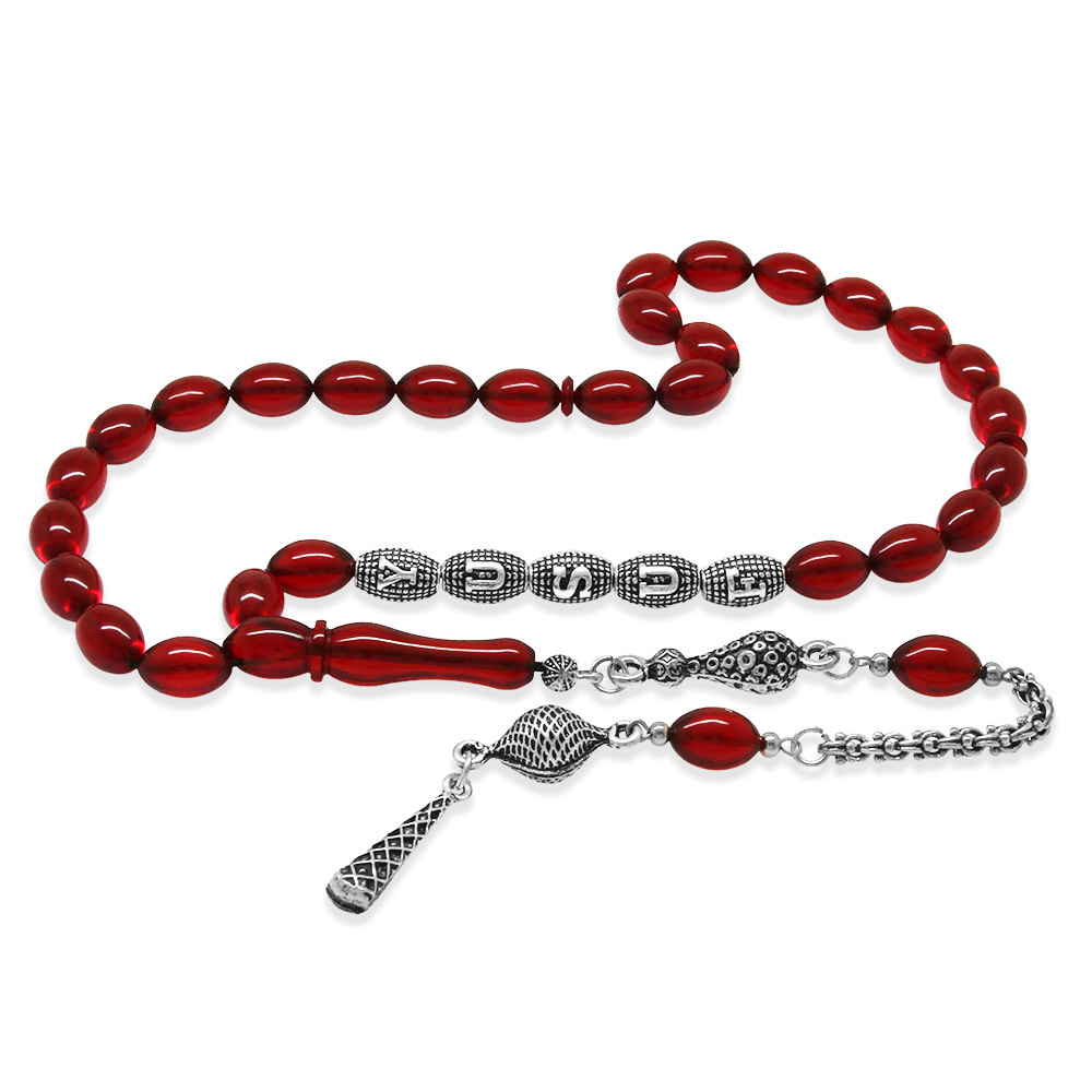 Kararmaz Metal Püsküllü İsme Özel Yazılı Arpa Kesim Bayrak Kırmızı Ateş Kehribar Tesbih