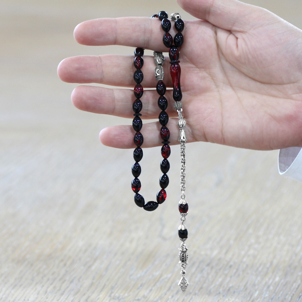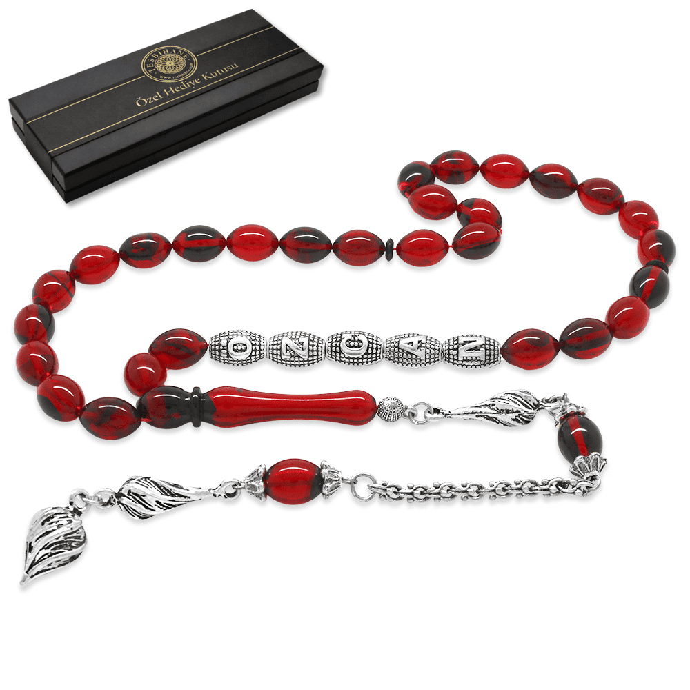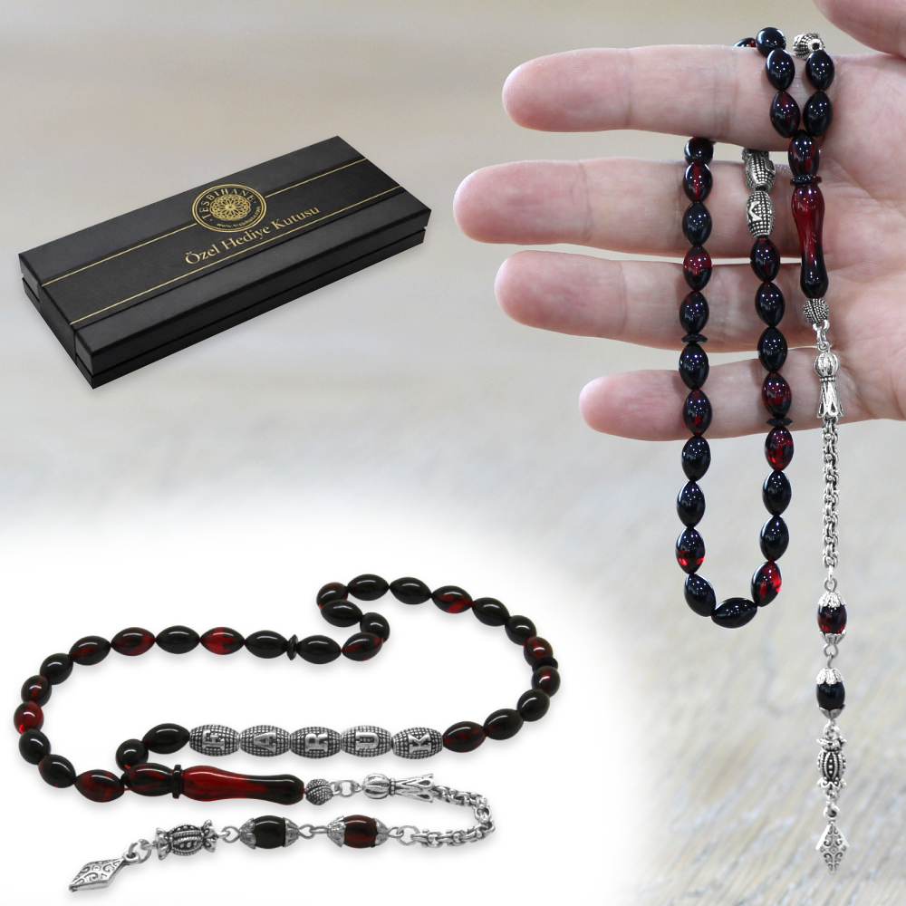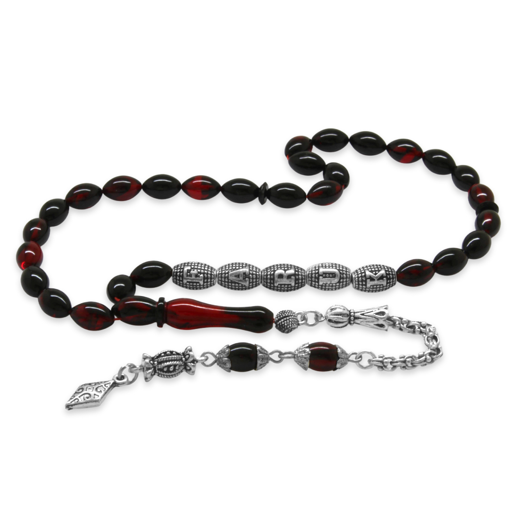 Kararmaz Metal Püsküllü İsme Özel Yazılı Arpa Kesim Kırmızı Siyah Ateş Kehribar Tesbih