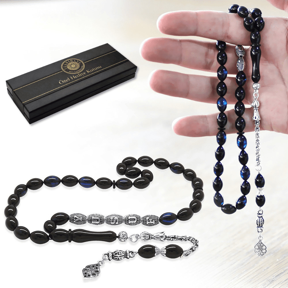 Kararmaz Metal Püsküllü İsme Özel Yazılı Arpa Kesim Mavi Siyah Sıkma Kehribar Tesbih