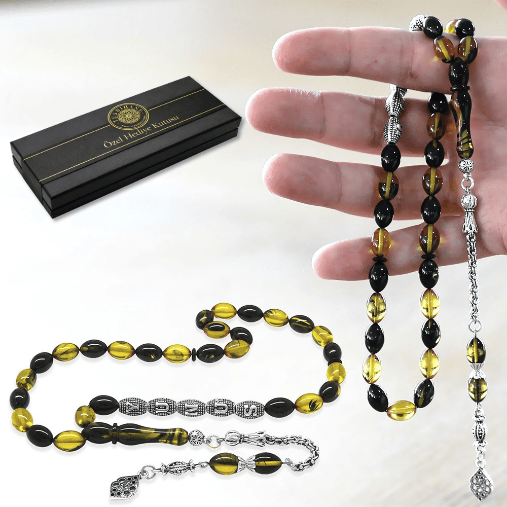 Kararmaz Metal Püsküllü İsme Özel Yazılı Arpa Kesim Sarı Siyah Ateş Kehribar Tesbih