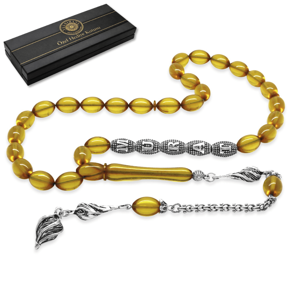Kararmaz Metal Püsküllü İsme Özel Yazılı Arpa Kesim Şeffaf Sarı Ateş Kehribar Tesbih