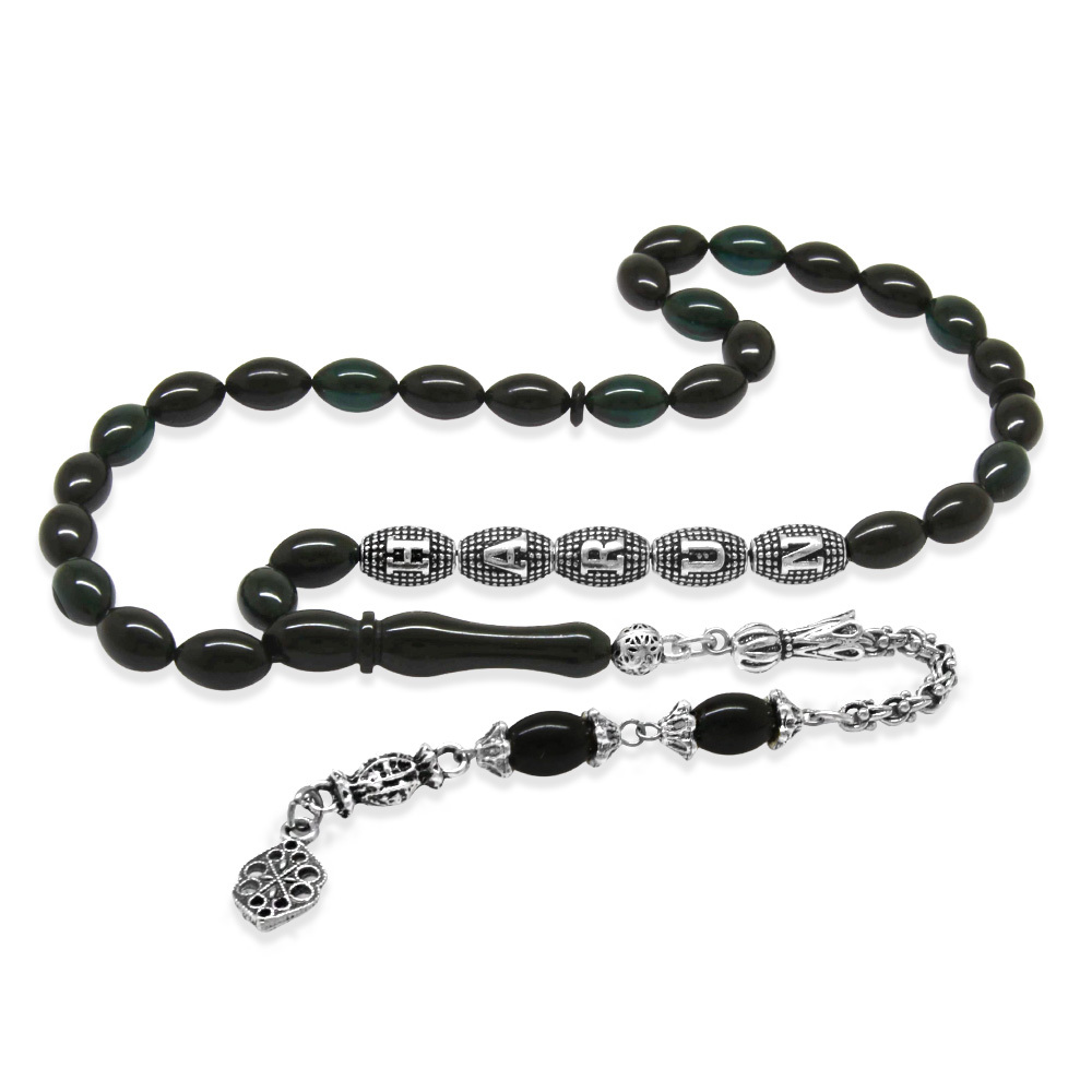 Kararmaz Metal Püsküllü İsme Özel Yazılı Arpa Kesim Turkuaz Siyah Ateş Kehribar Tesbih - 1
