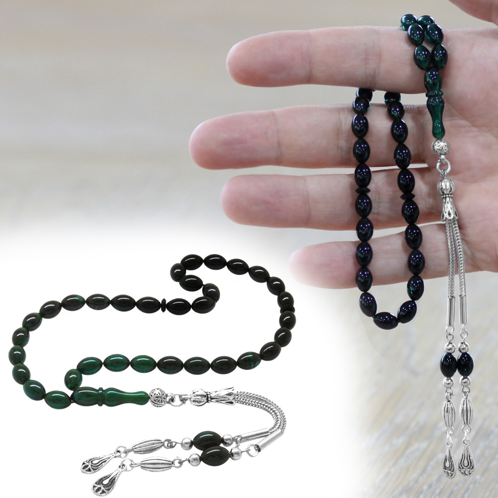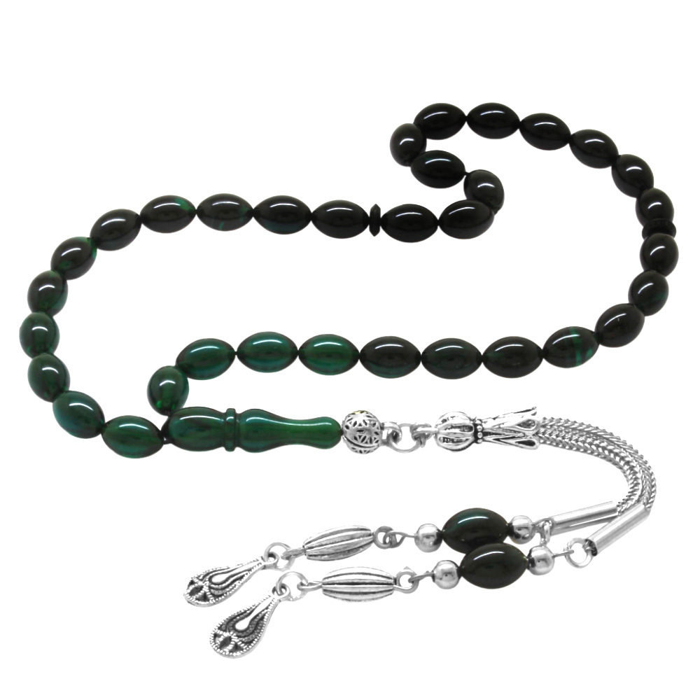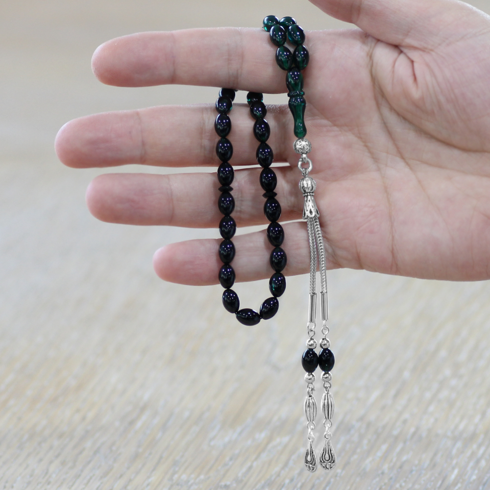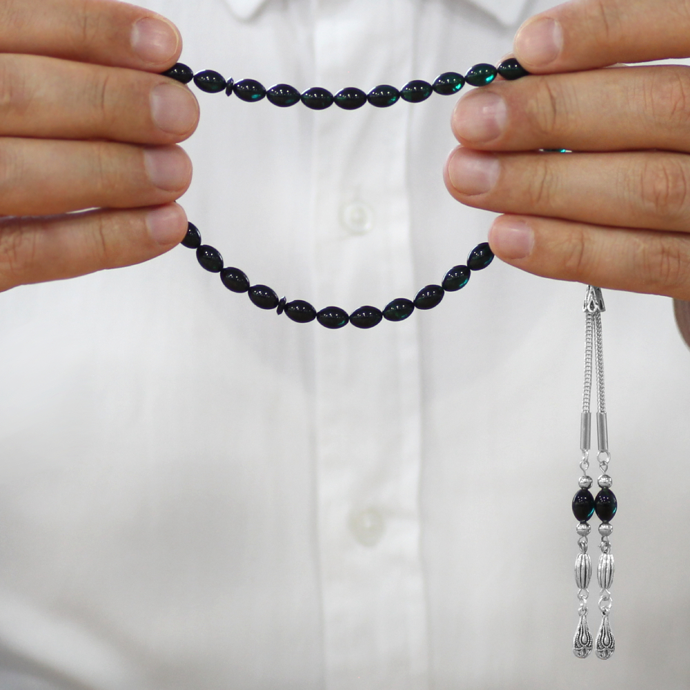 Ateş Kehribar Tesbih - Kararmaz Metal Damla Püsküllü - Süzme Turkuaz Siyah - Bilek Boy - Arpa Kesim