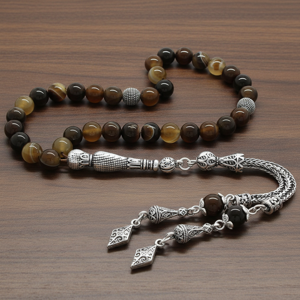 Kararmaz Metal Püsküllü Küre Kesim Madagaskar Akik Doğaltaş Tesbih