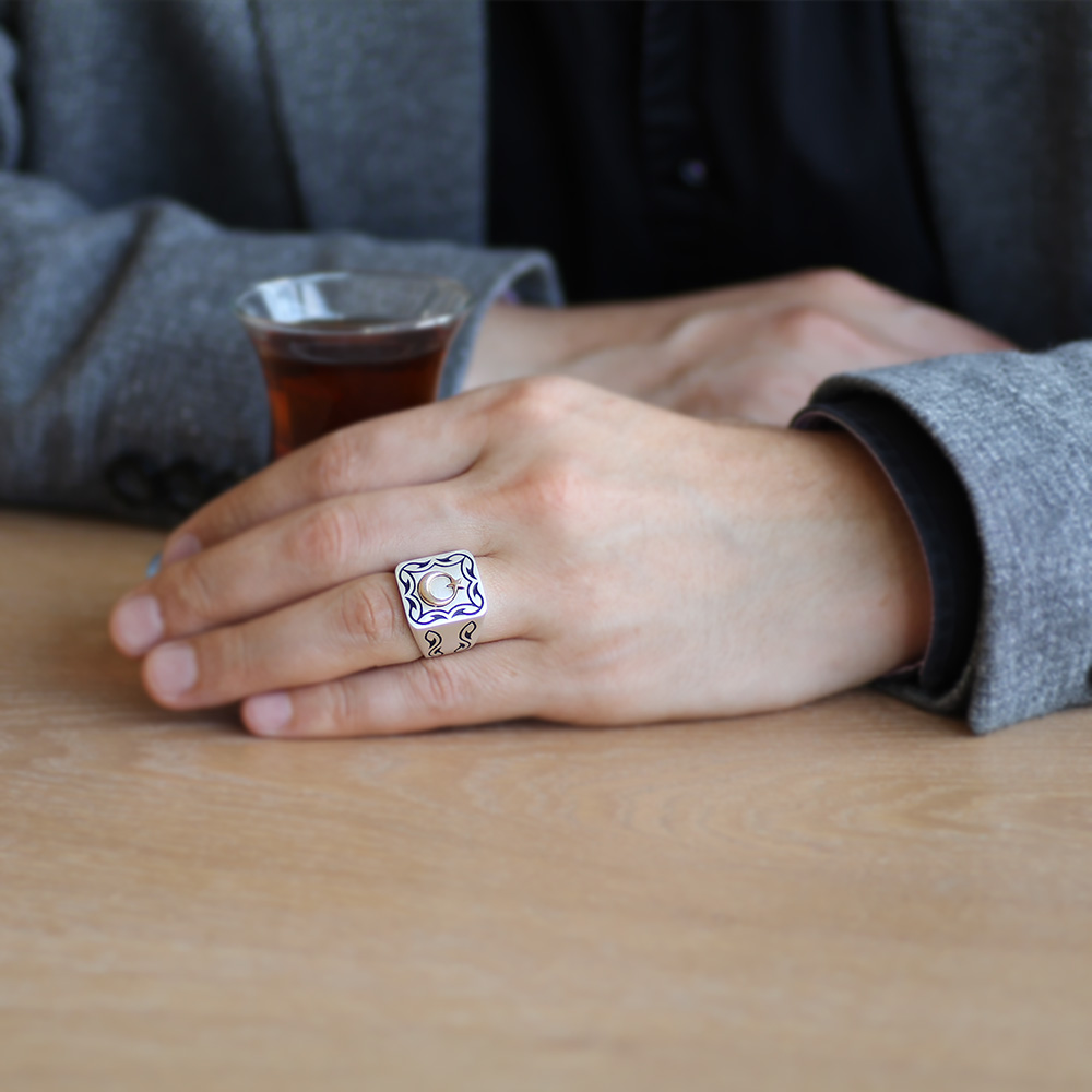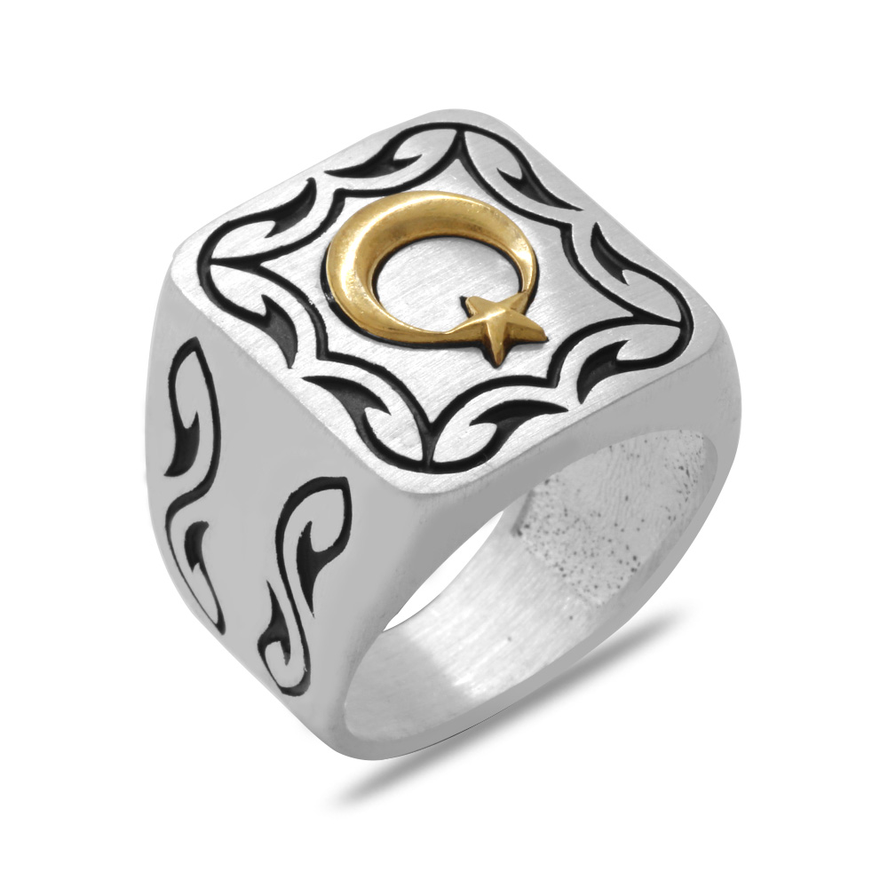 Kare Tasarım Ayyıldız Temalı Özel Renk 925 Ayar Gümüş Erkek Yüzük