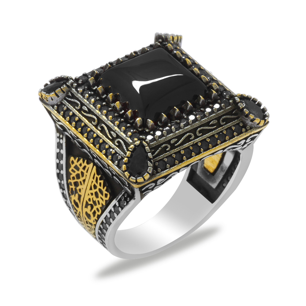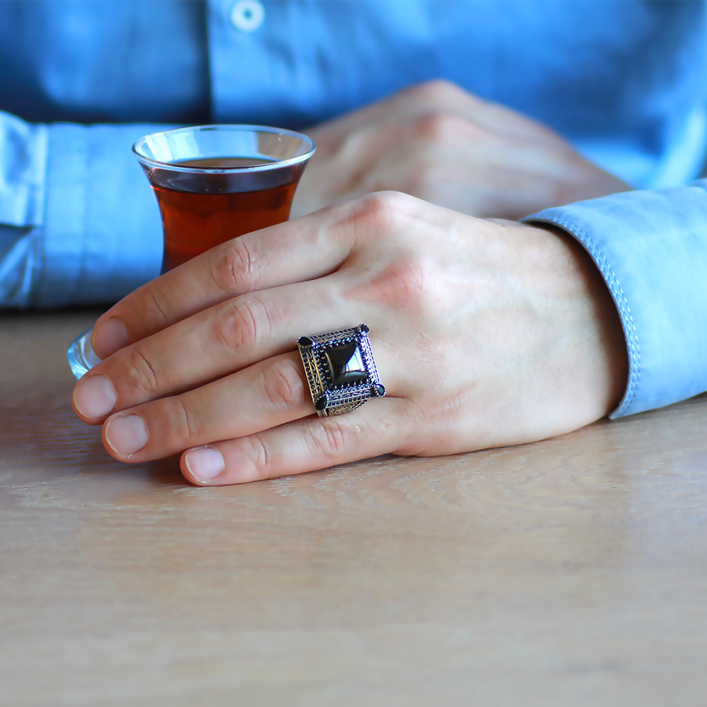 Kare Tasarım Siyah Zirkon Taşlı Çevresi Mikro Taş Mıhlamalı 925 Ayar Gümüş Erkek Yüzük - 1