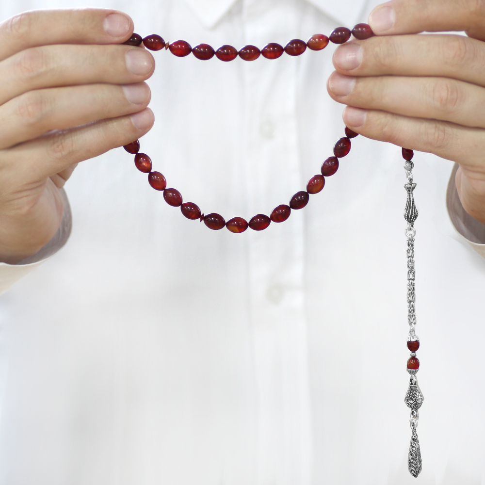 Katalin Tesbih - Kararmaz Metal Kral Zincir Püsküllü - Küre Kesim - Sedefli Kırmızı Renk