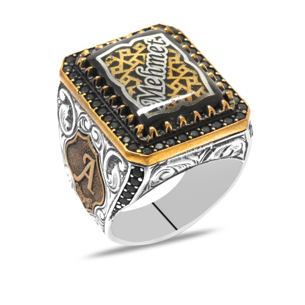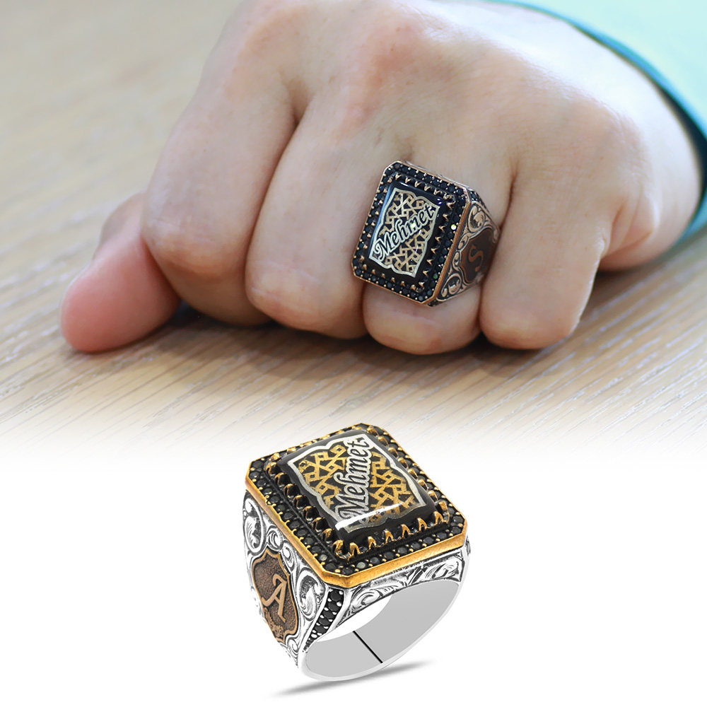 Kenarları Harf Yazılabilir İsme Özel Yazılı Mineli 925 Ayar Gümüş Erkek Yüzük