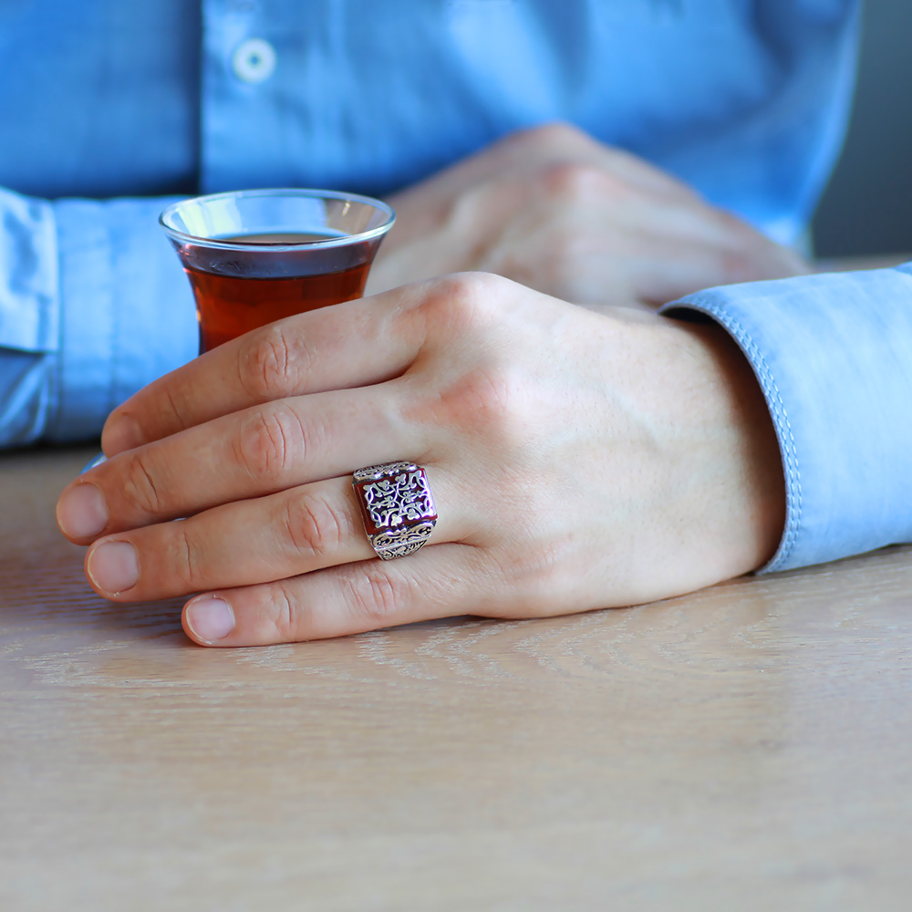 Kırmızı Akik Taşlı Kalem İşçilikli Sarmaşık Desen Temalı 925 Ayar Gümüş Erkek Yüzük - 4