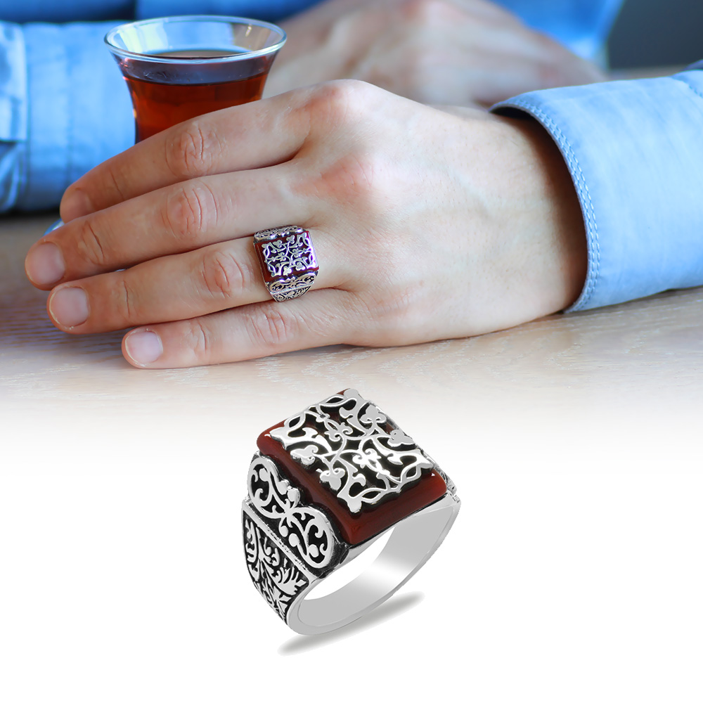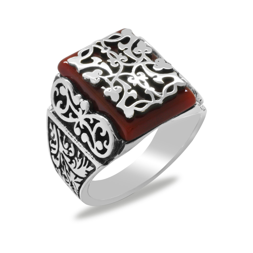 Kırmızı Akik Taşlı Kalem İşçilikli Sarmaşık Desen Temalı 925 Ayar Gümüş Erkek Yüzük