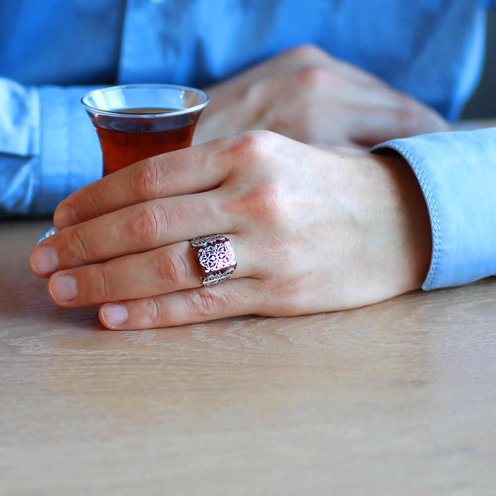Kırmızı Akik Taşlı Kalem İşçilikli Selçuklu Deseni Temalı 925 Ayar Gümüş Erkek Yüzük - 1