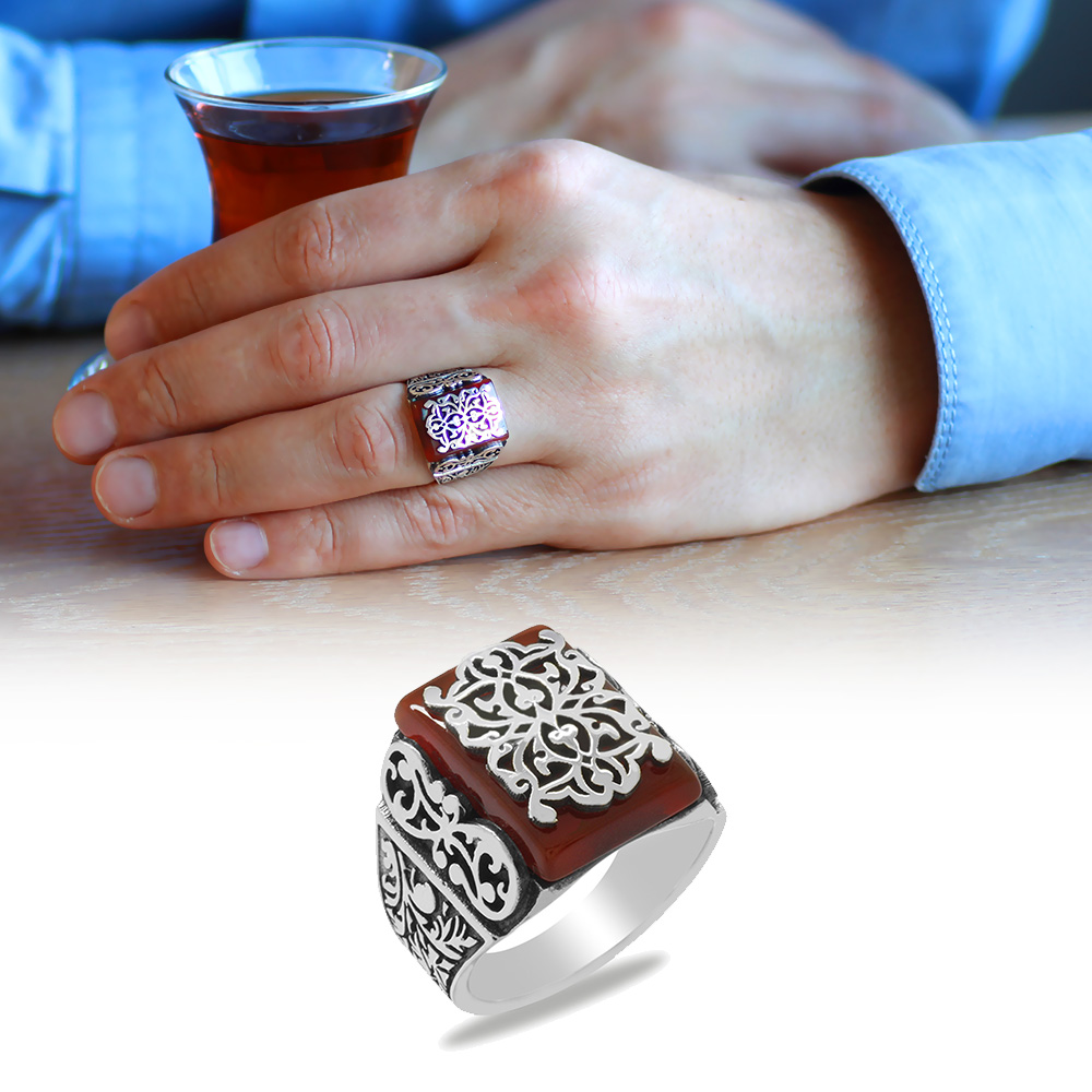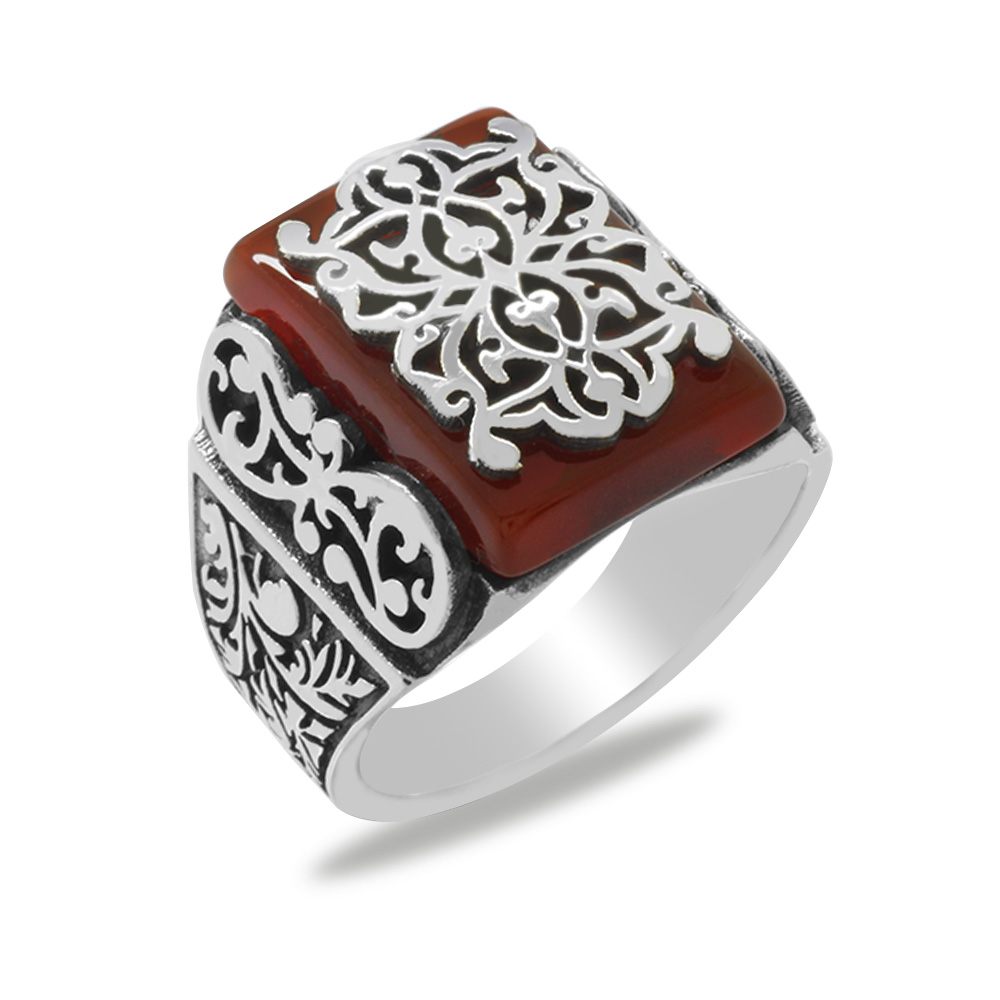 Kırmızı Akik Taşlı Kalem İşçilikli Selçuklu Deseni Temalı 925 Ayar Gümüş Erkek Yüzük