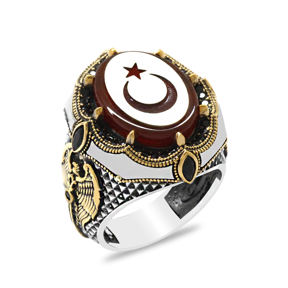 Kırmızı Kehribar Üzerine Ayyıldız Desenli Çift Başlı Kartal Detaylı 925 Ayar Gümüş Erkek Yüzük
