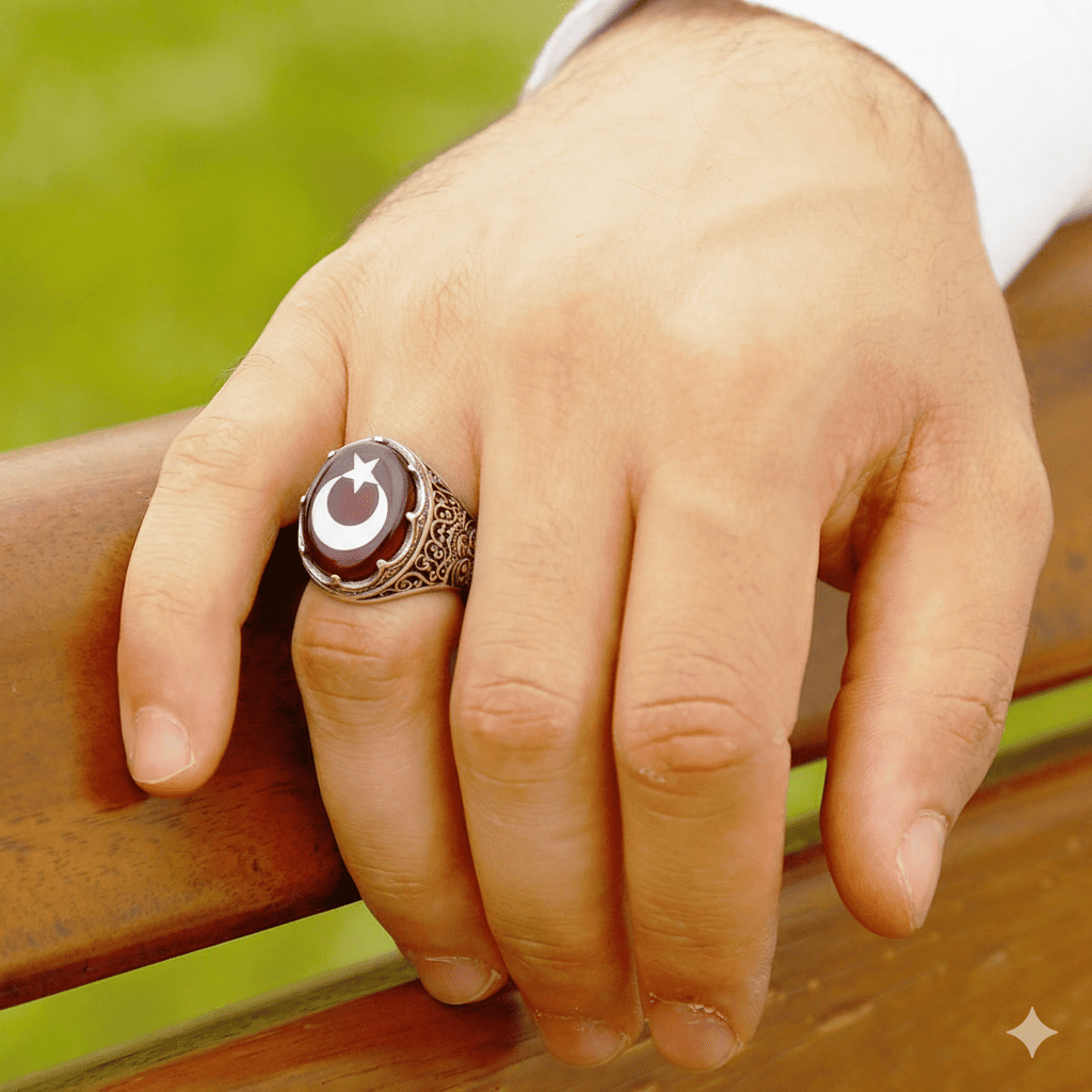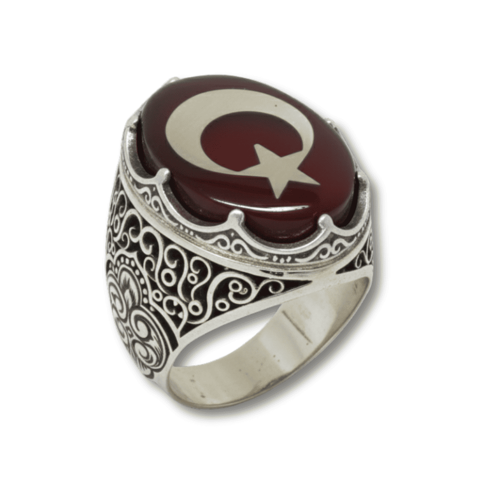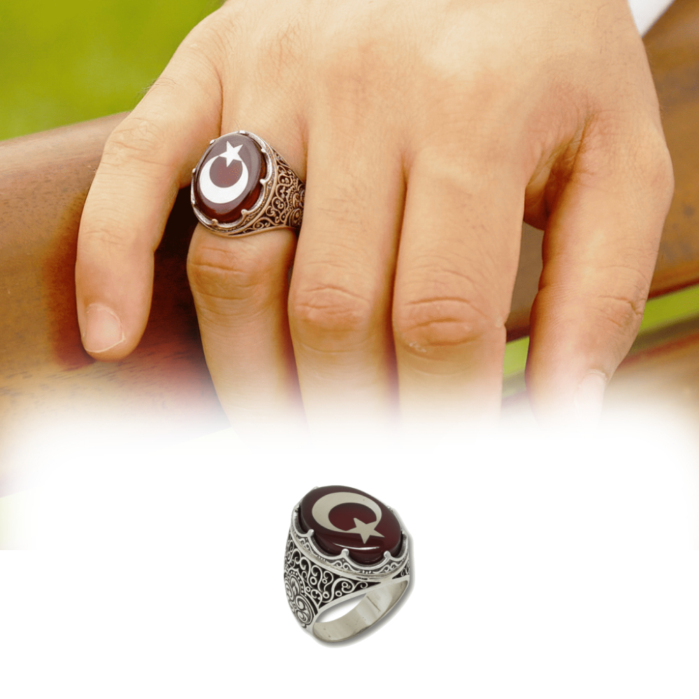 Kırmızı Kehribar Üzerine Ayyıldız Desenli Kral Tacı Detaylı Oval Tasarım 925 Ayar Gümüş Erkek Yüzük